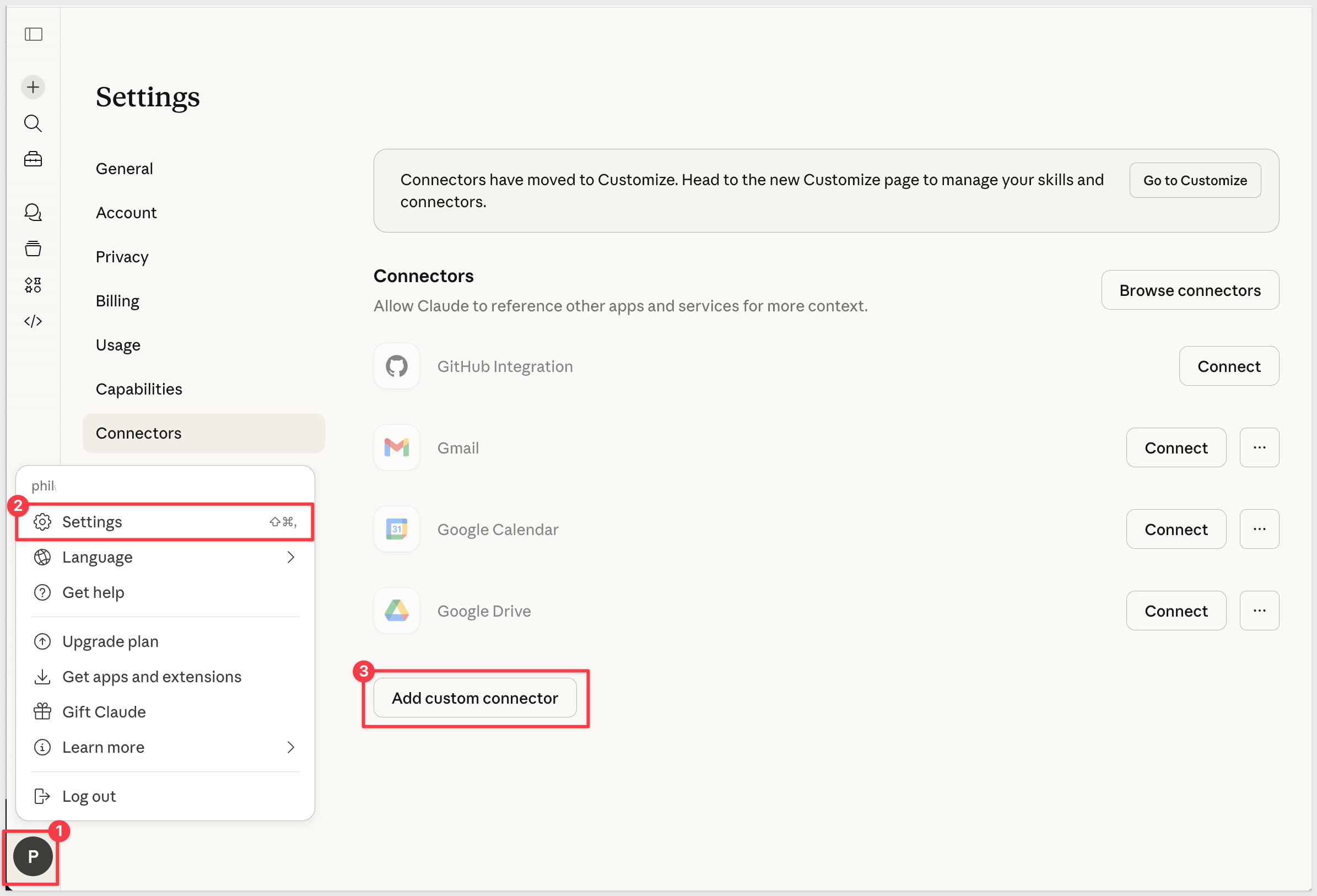 In claude.ai, click your profile icon and select Settings > Connectors > Add a custom connector: