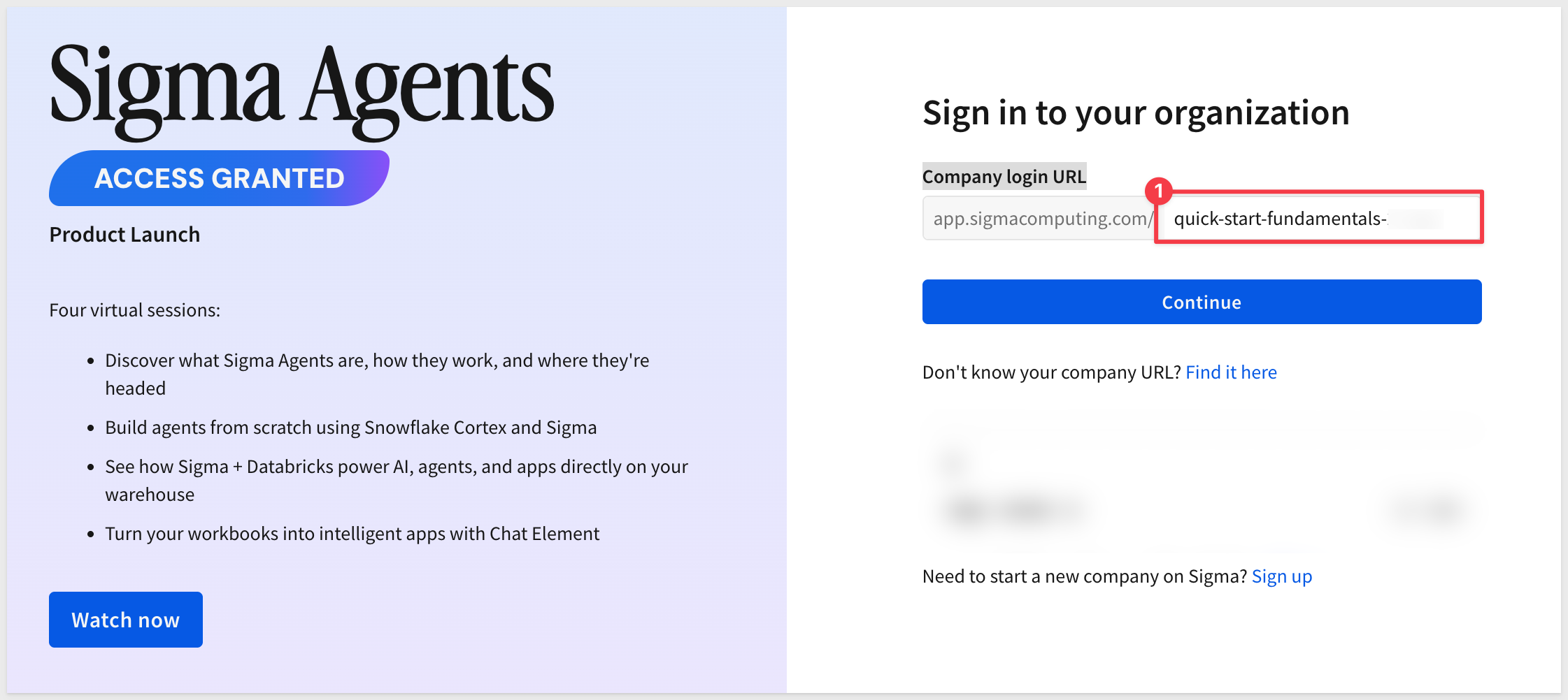 When prompted, enter your Sigma instance name and click Continue. Provide your Sigma credentials and log in.