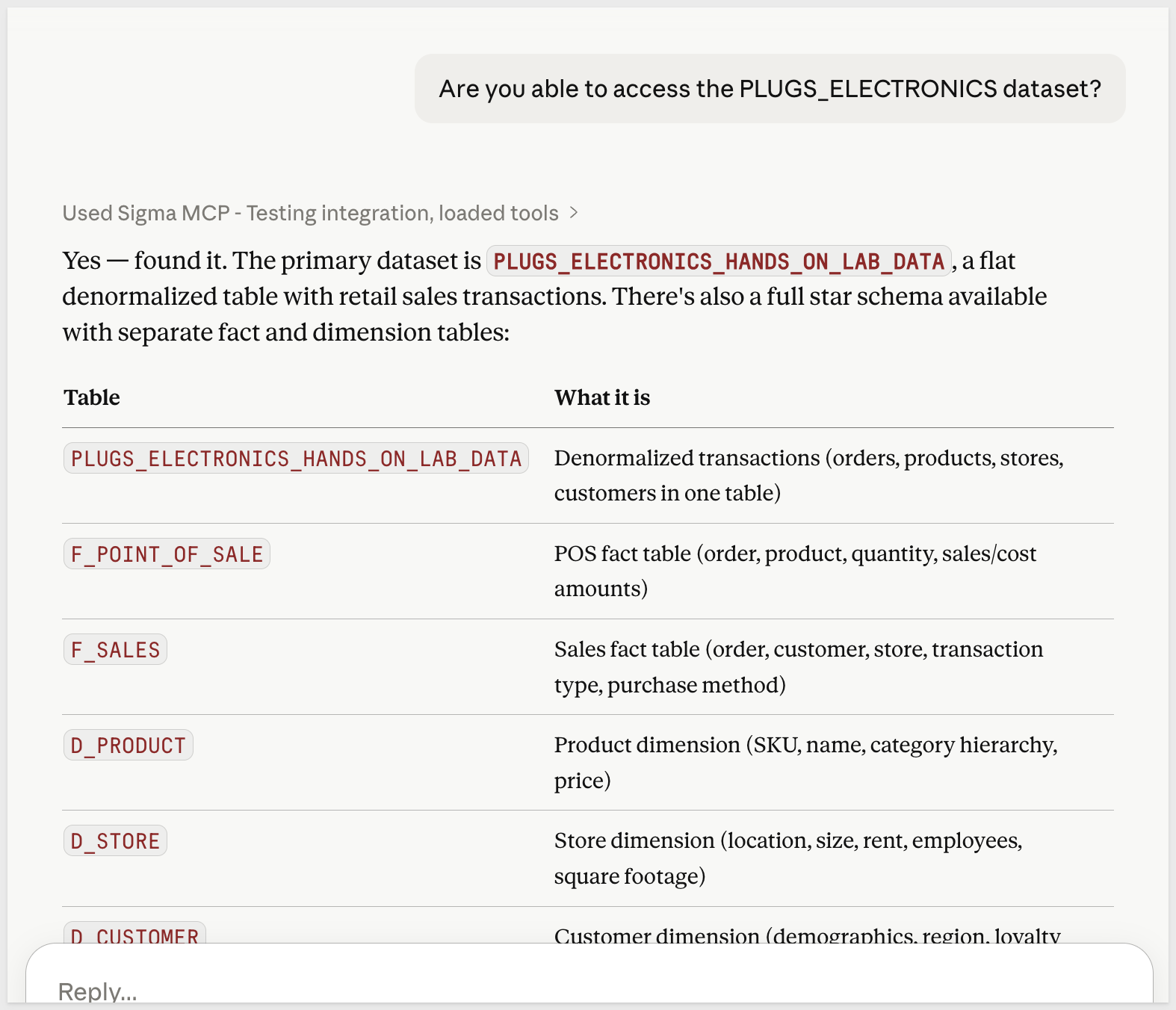 Claude will call the Sigma MCP and reply with some details: