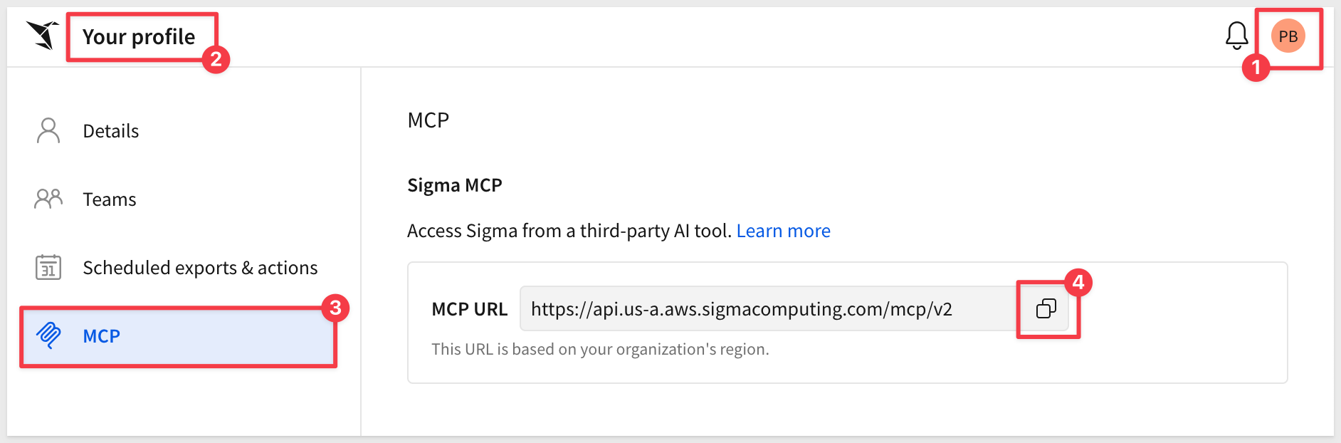 In Sigma, click your profile icon and navigate to Profile > MCP. Copy your personal MCP server URL: