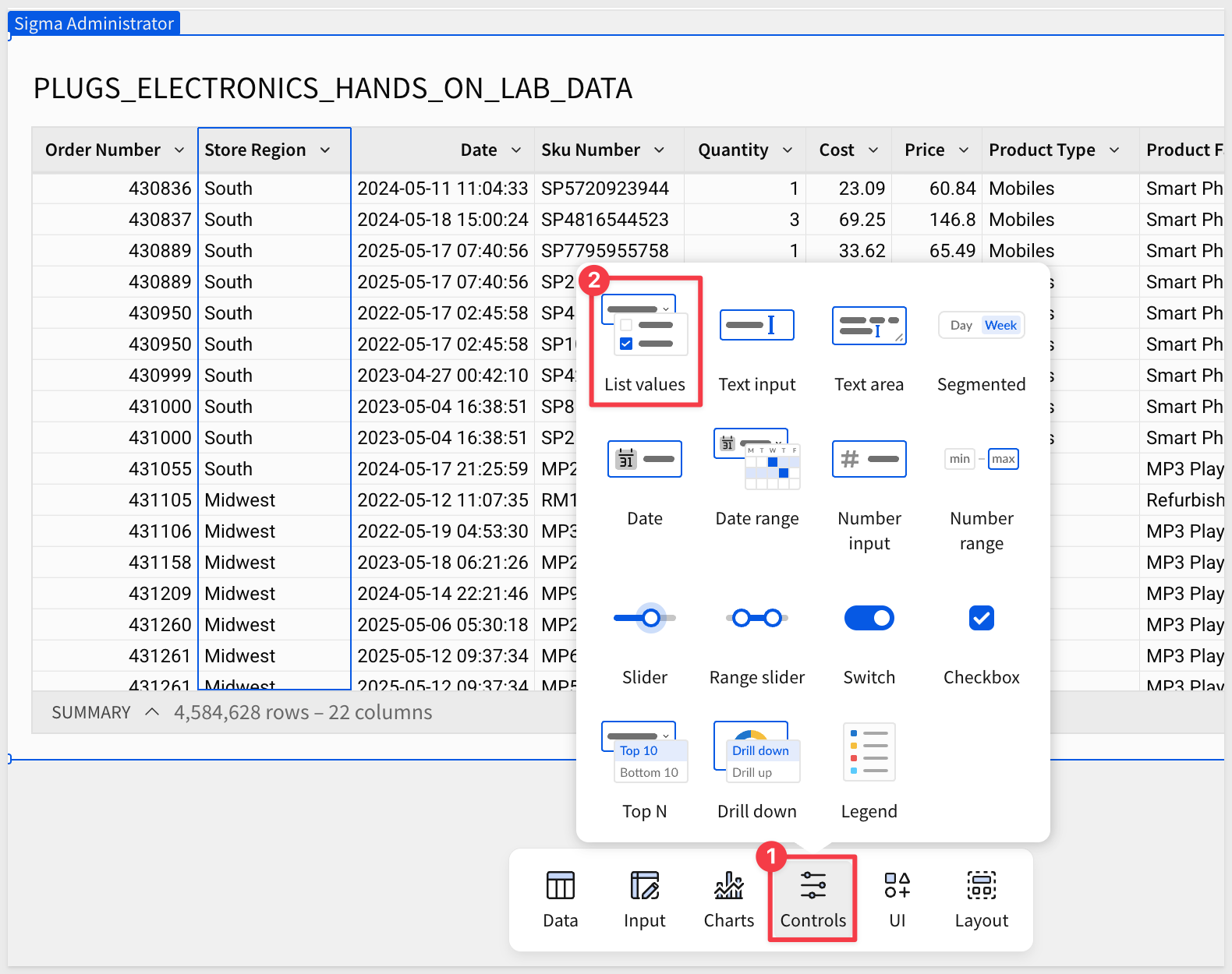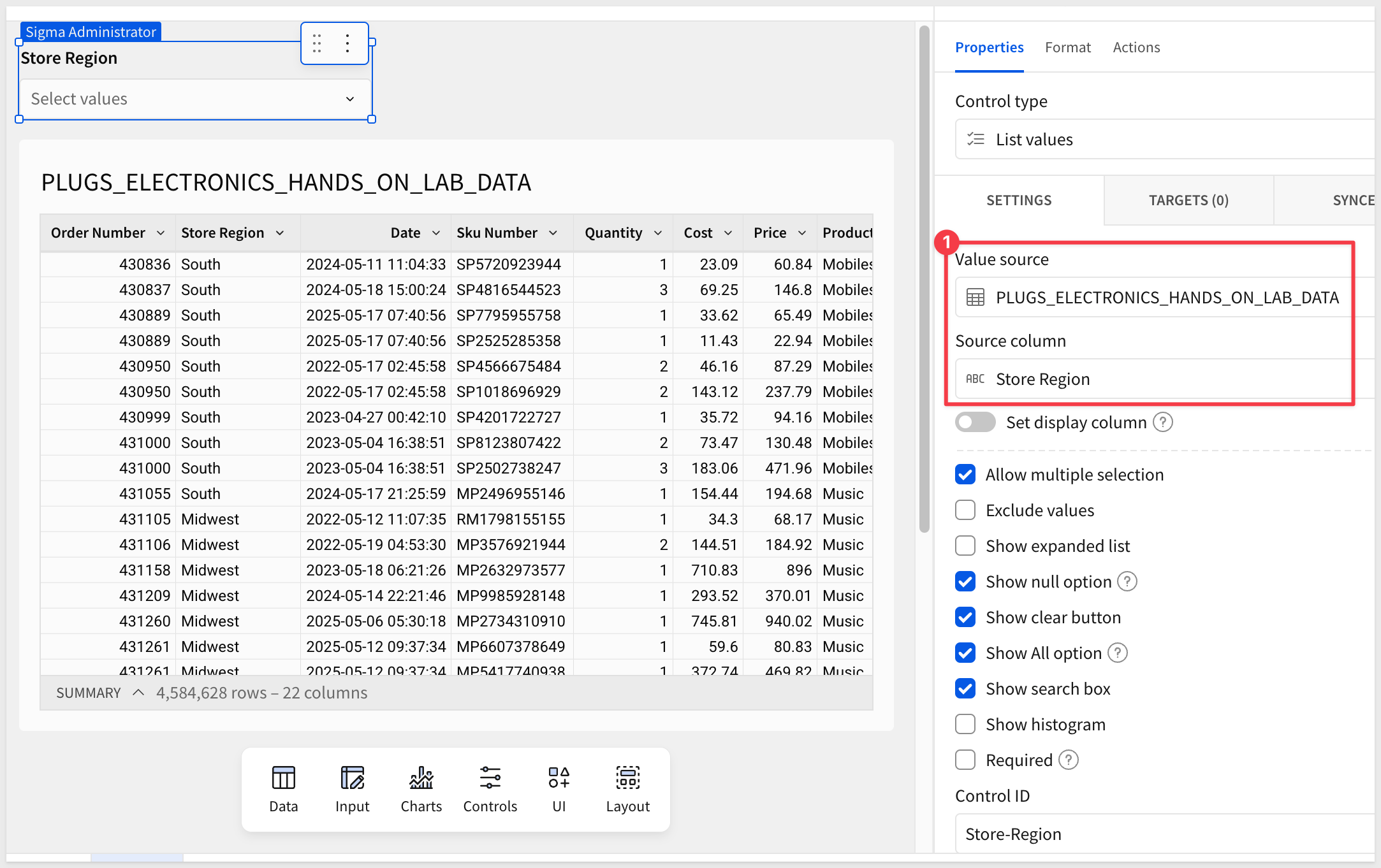 Configure the Target of the control to be the PLUGS_ELECTRONICS_HANDS_ON_LAB_DATA table > Store Region column: