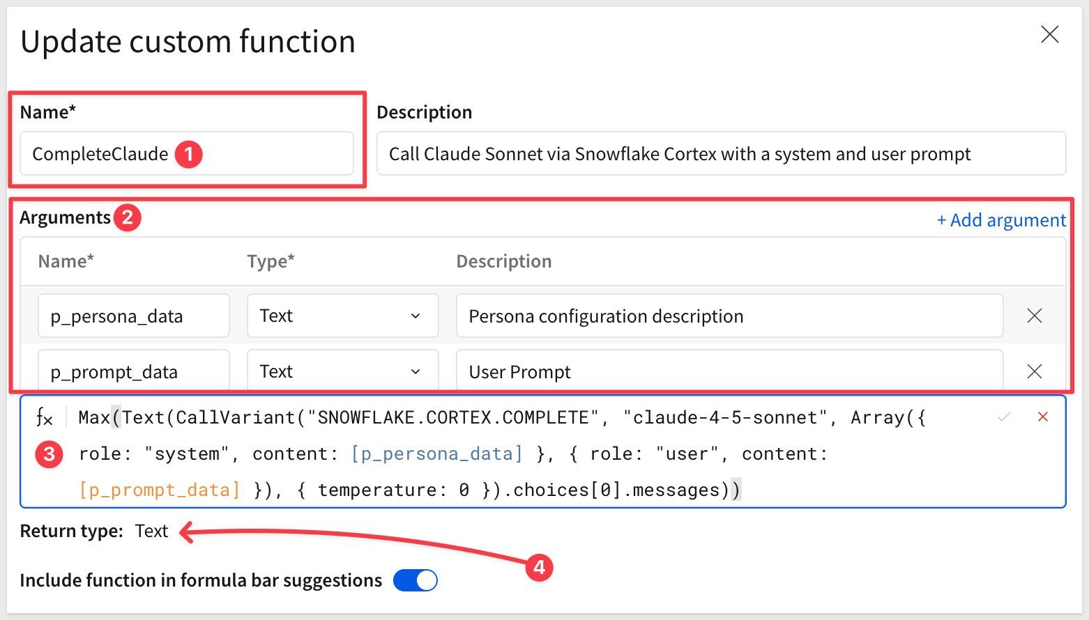 This formula sends a prompt to Claude 4.5 Sonnet using Snowflake Cortex and returns the AI's text response as a string.