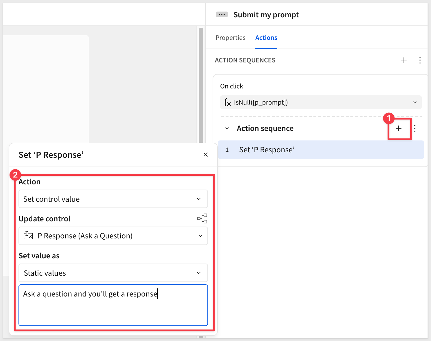 Add an action by clicking the + icon and configure it to set the P Response (Ask a Question) page to have a static value: