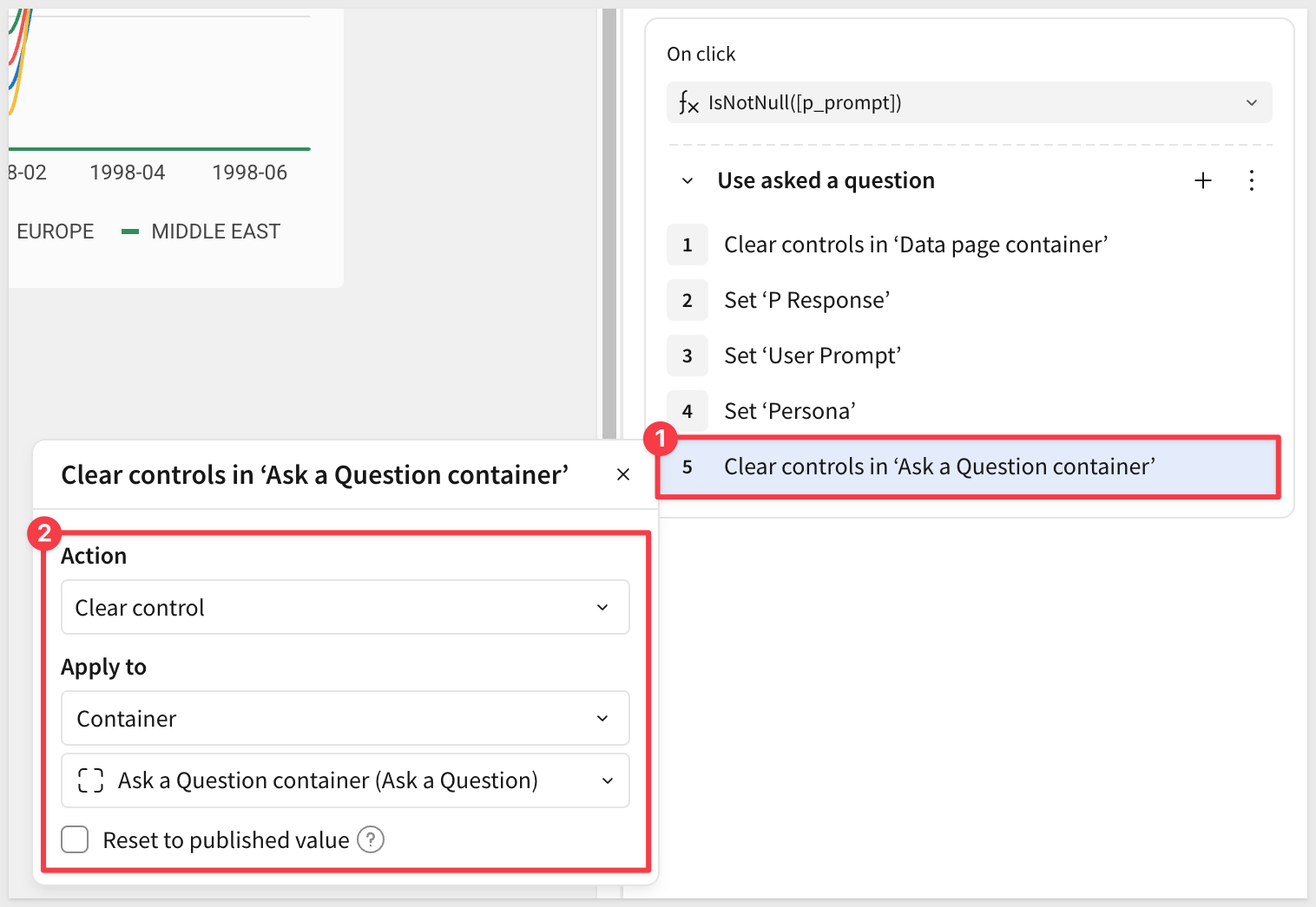Now that we've captured the user's input into the Data page controls, we can clear the Ask a Question container. This removes the old prompt, persona selection, and previous response from view.