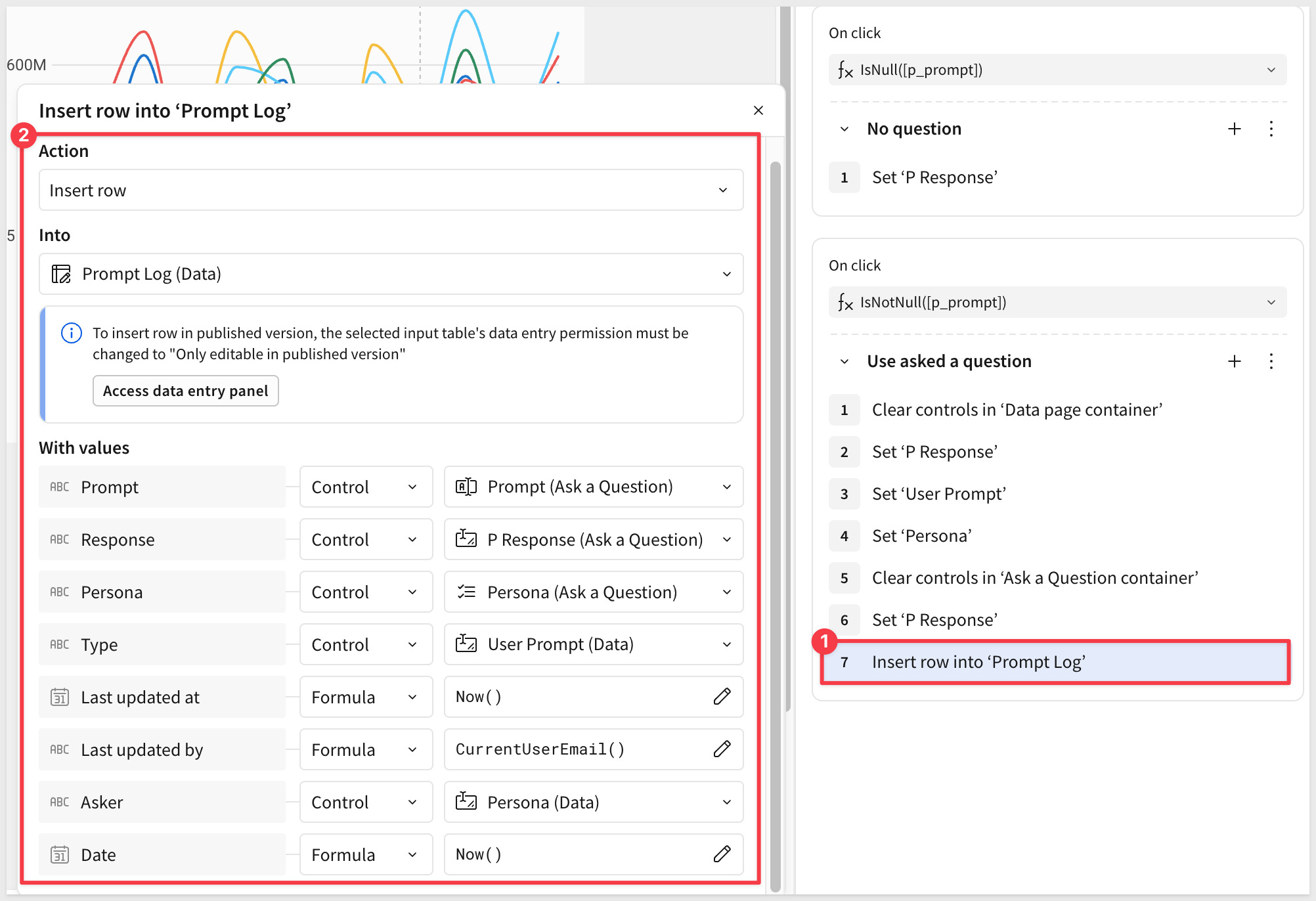Add another action, this time selecting to Insert a row into the Prompt Log input table on the Data page.