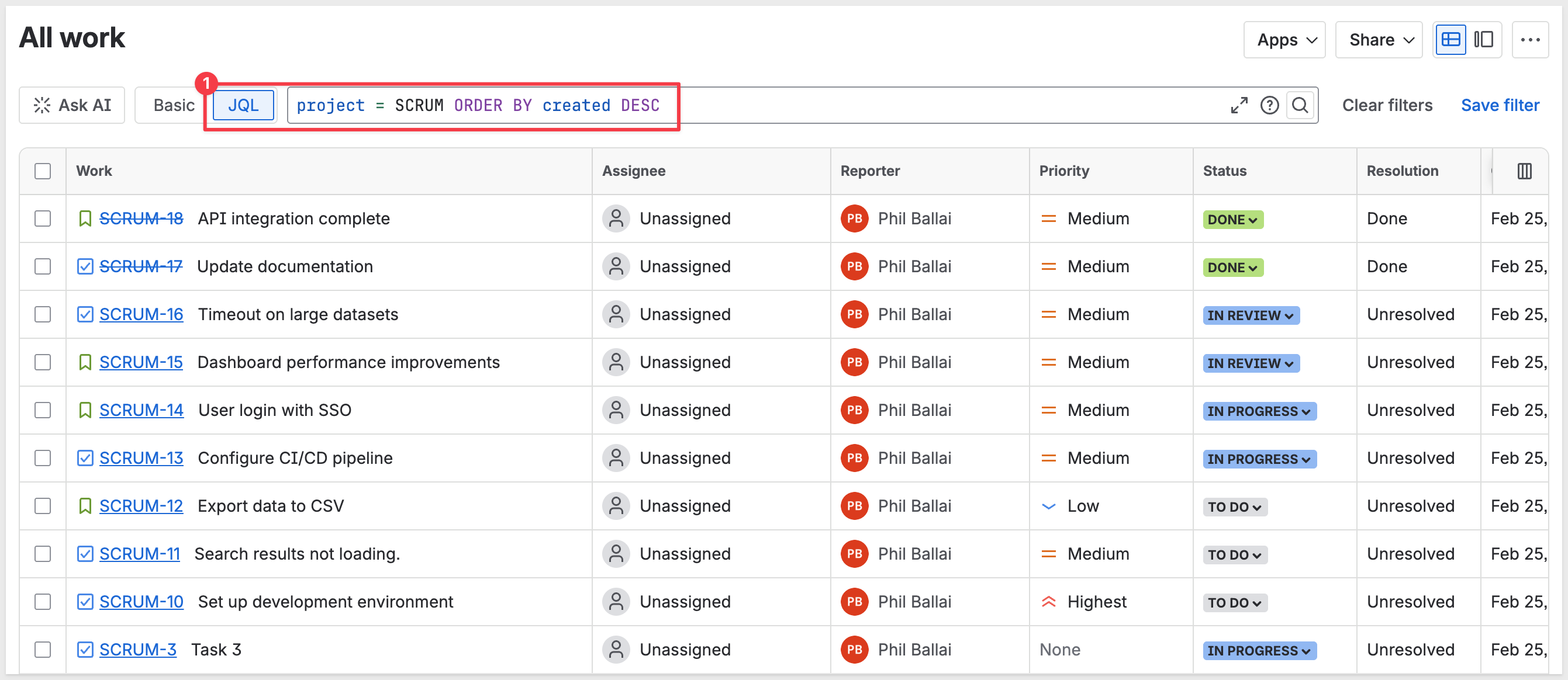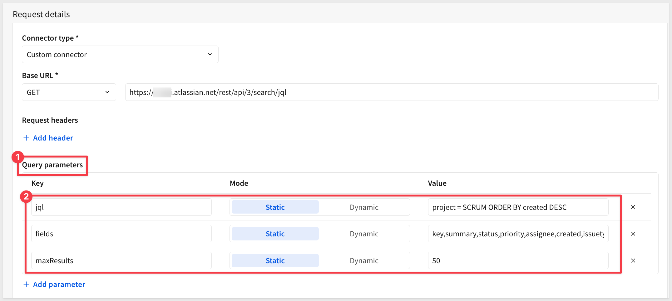 Query parameters section, click Add parameter: jqlStaticproject = SCRUM ORDER BY created DESCThis default JQL query retrieves all issues from the SCRUM project, ordered by creation date.