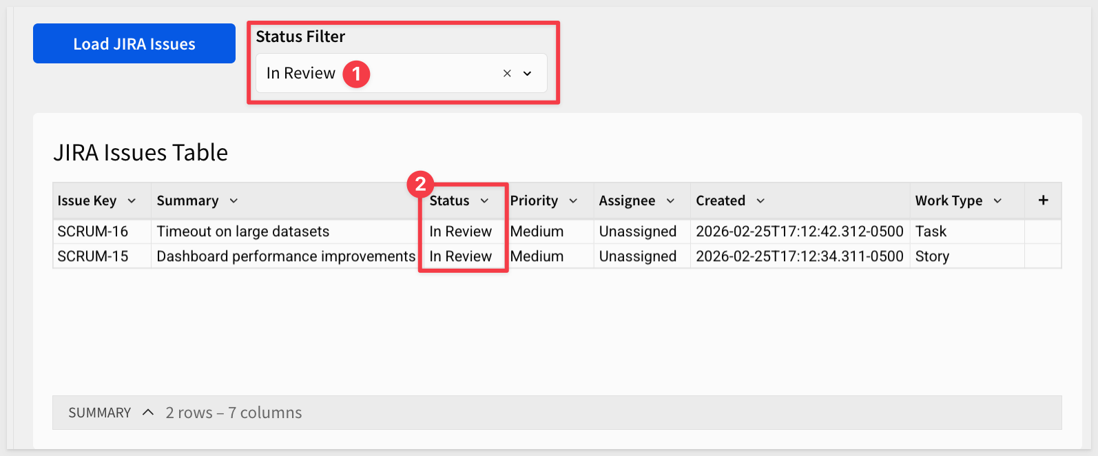 The the Python will run, raw-response will update and the table will update to show only issues matching the selected status - no need to click the button.