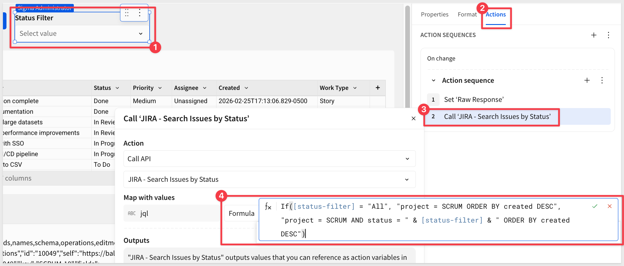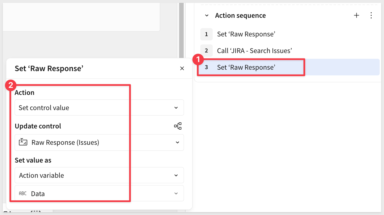 Set control valueRaw API ResponseAction variableCall 'JIRA - Search Issues' - Data