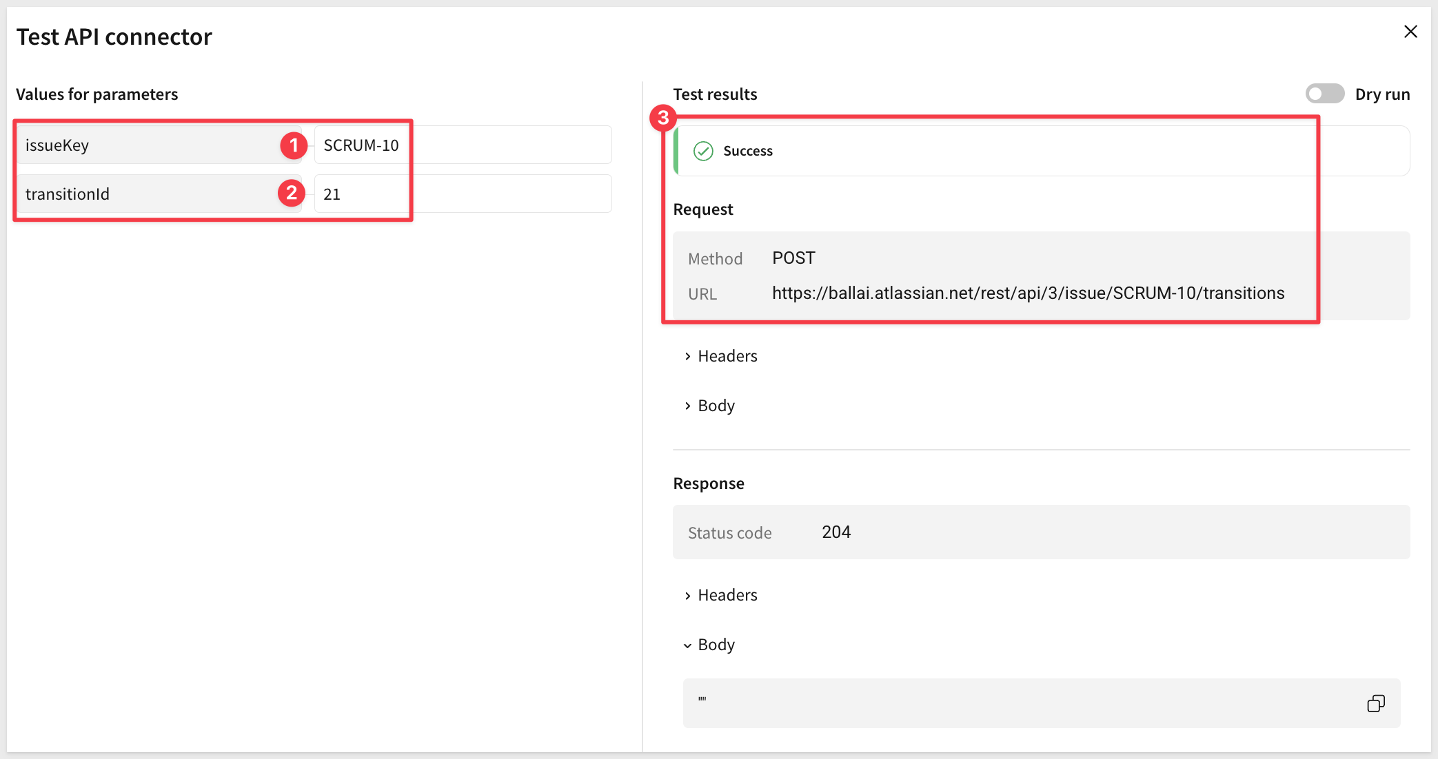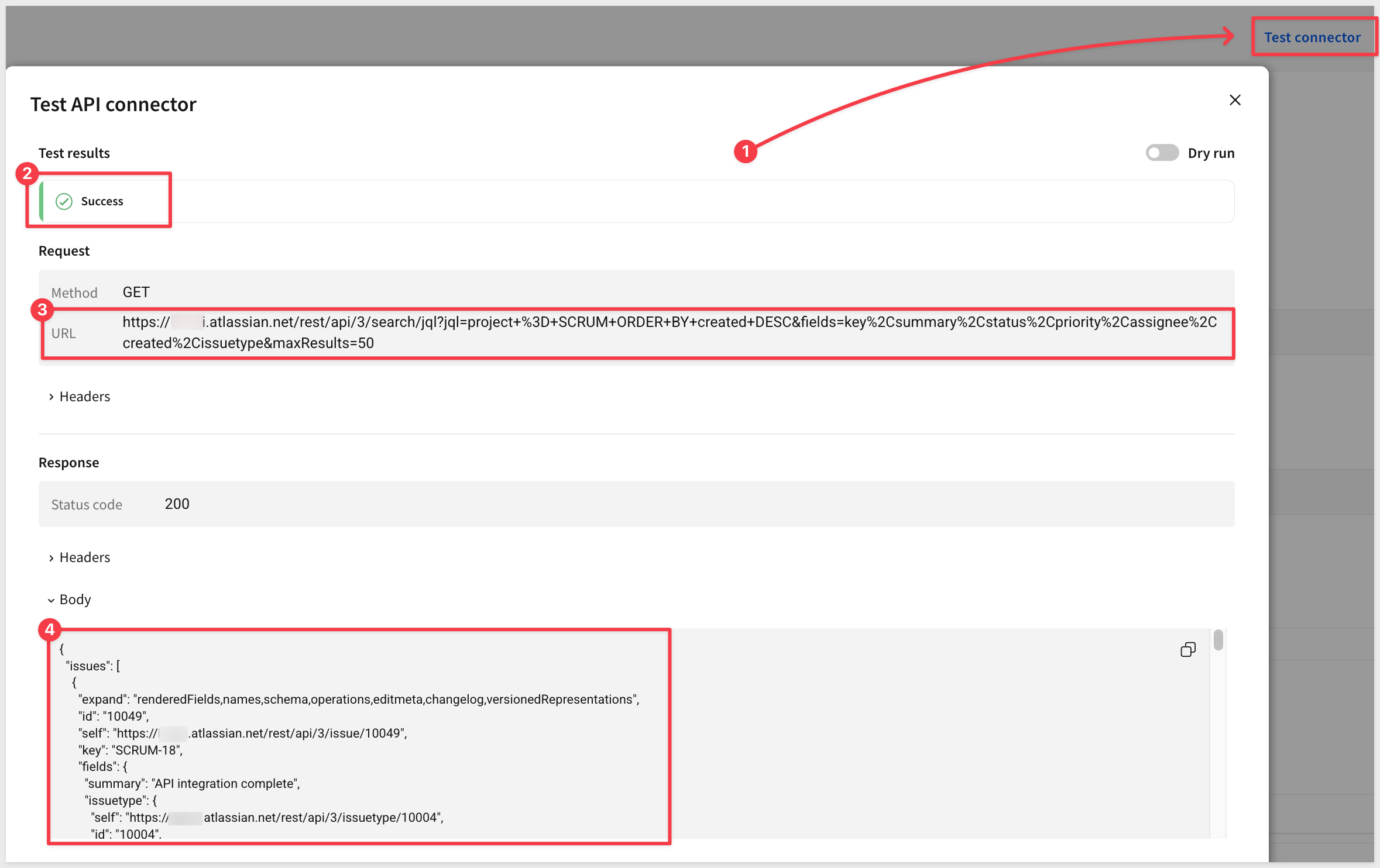 Test connector to verify the connector works.You should see a successful response with JIRA issue data in JSON format, now including all the fields (key, summary, status, etc.):