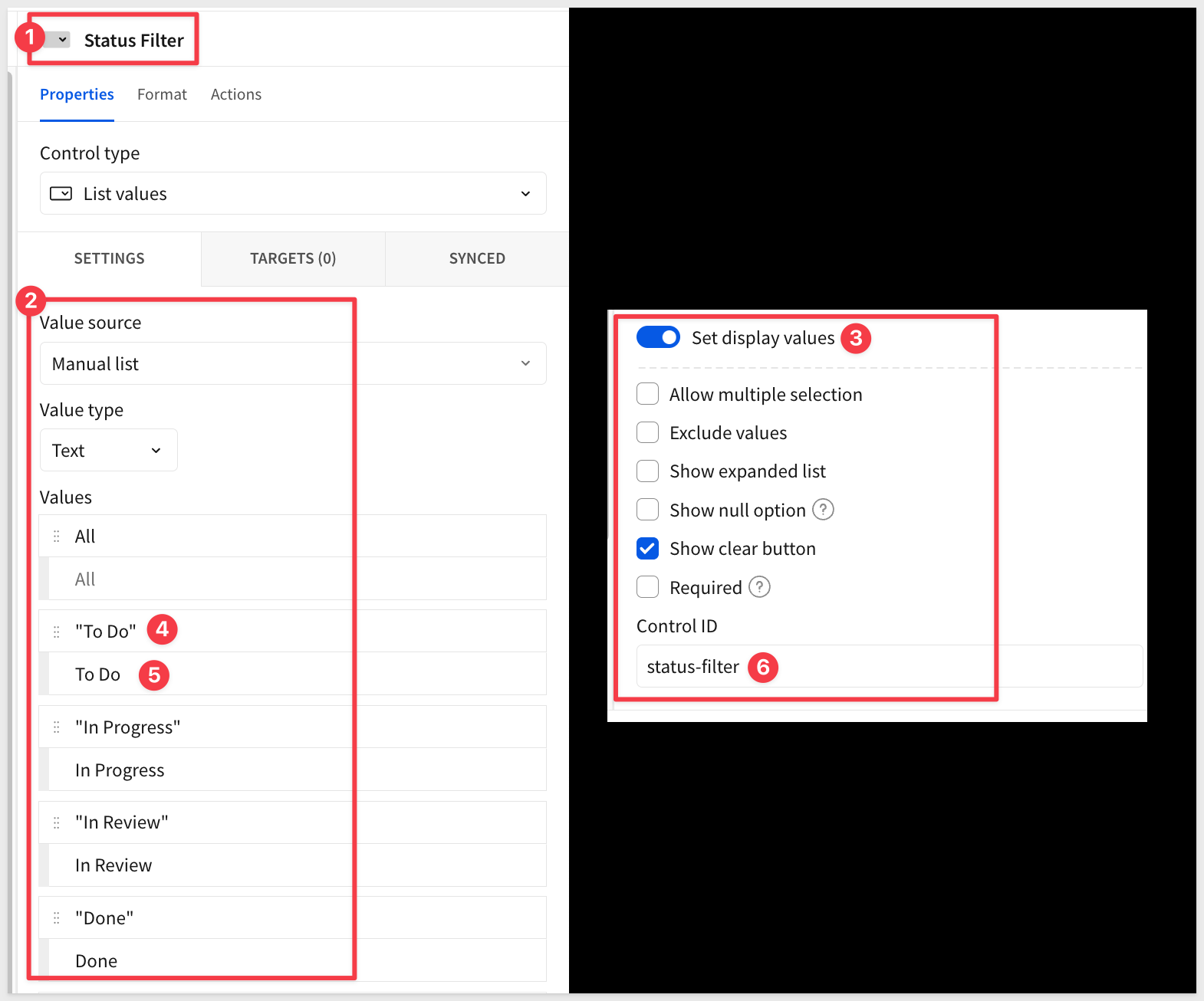 List values control from the Controls groupstatus-filterSet display valuesAll → Value: AllTo Do → Value: "To Do"In Progress → Value: "In Progress"In Review → Value: "In Review"Done → Value: "Done"This separates what users see (clean text without quotes) from what gets used in formulas (values with quotes for JQL).