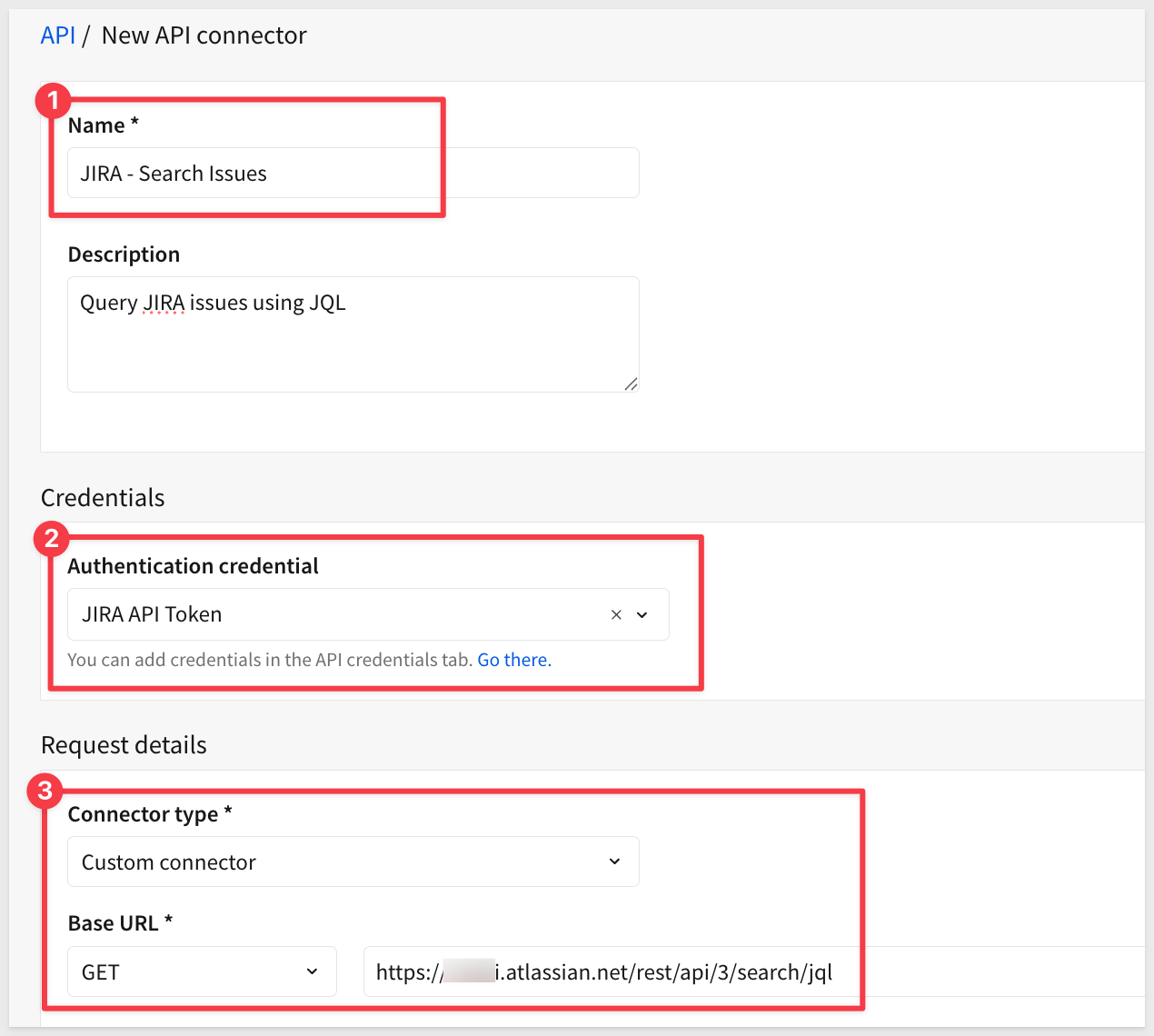Administration > API Connectors page, select the API connectors tab.Create connectorJIRA - Search IssuesQuery JIRA issues using JQLJIRA API Token (the credential we created)Request details section, configure:Custom connectorGET and enter https://YOUR-DOMAIN.atlassian.net/rest/api/3/search/jql (replace YOUR-DOMAIN with your actual JIRA domain)