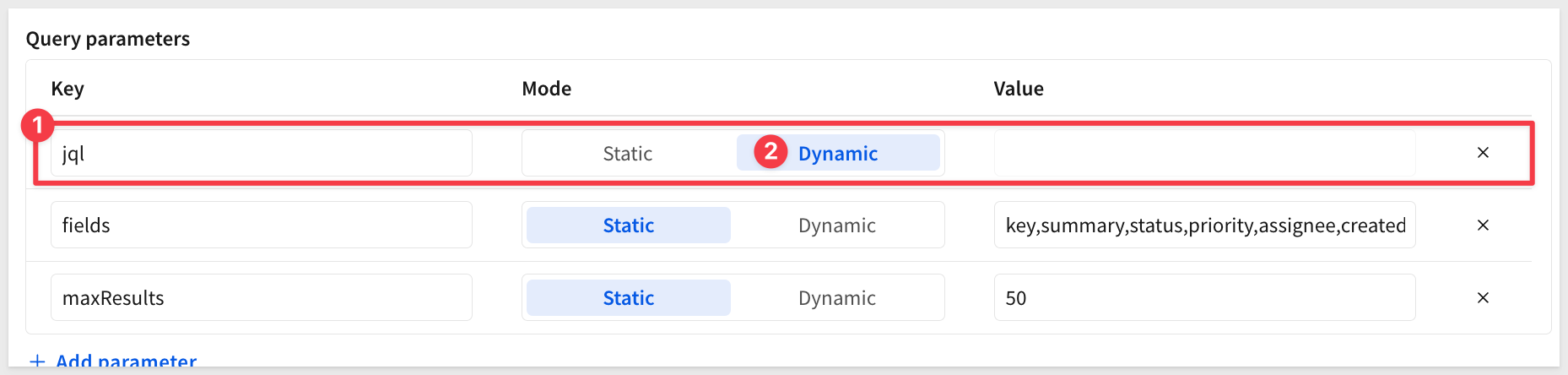 JIRA - Search Issues by StatusAuthentication credential to JIRA API Token.Query parameters section, find the jql parameterStatic to DynamicDynamic parameters don't have default values: