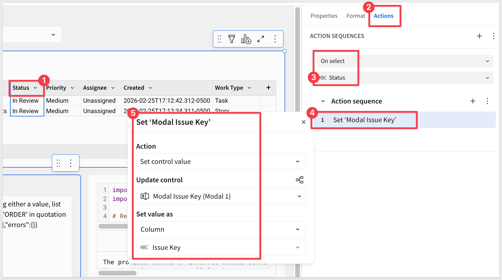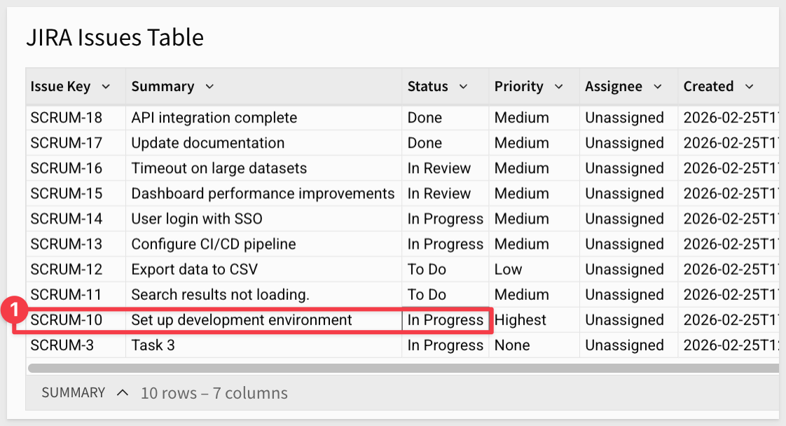 Open modalModal 1Now when users click a Status cell, the modal opens with the Modal Issue Key pre-filled:
