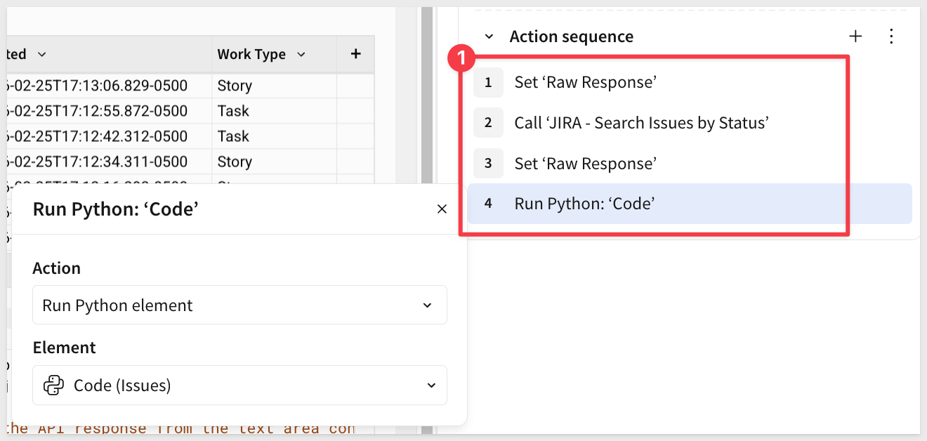 Set control valueraw-responseAction variableCall 'JIRA - Search Issues' - DataRun Python elementCode (Issues)This parses the fresh data and updates the table.