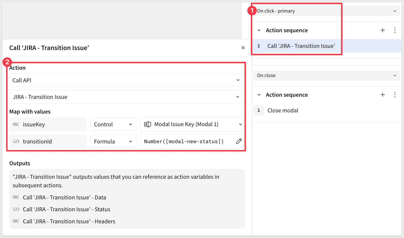 Modal 1, add the following action sequence to the On click - primary action sequence.Call APIJIRA - Transition IssueControl from the dropdownmodal-issue-keyFormula from the dropdown (not Control, since we need to convert to Number)Number([modal-new-status])