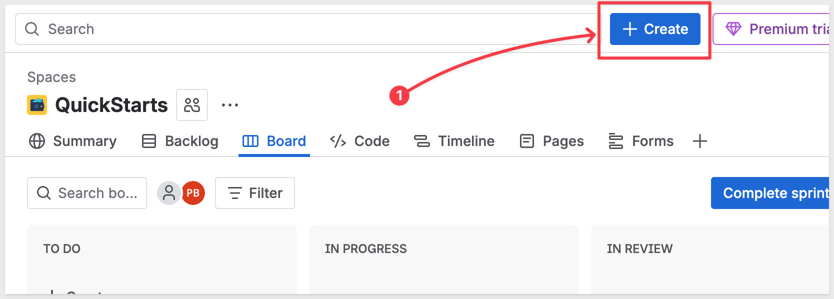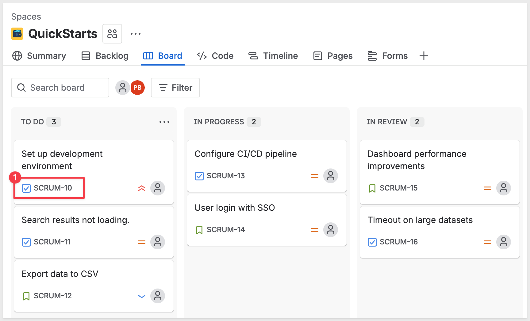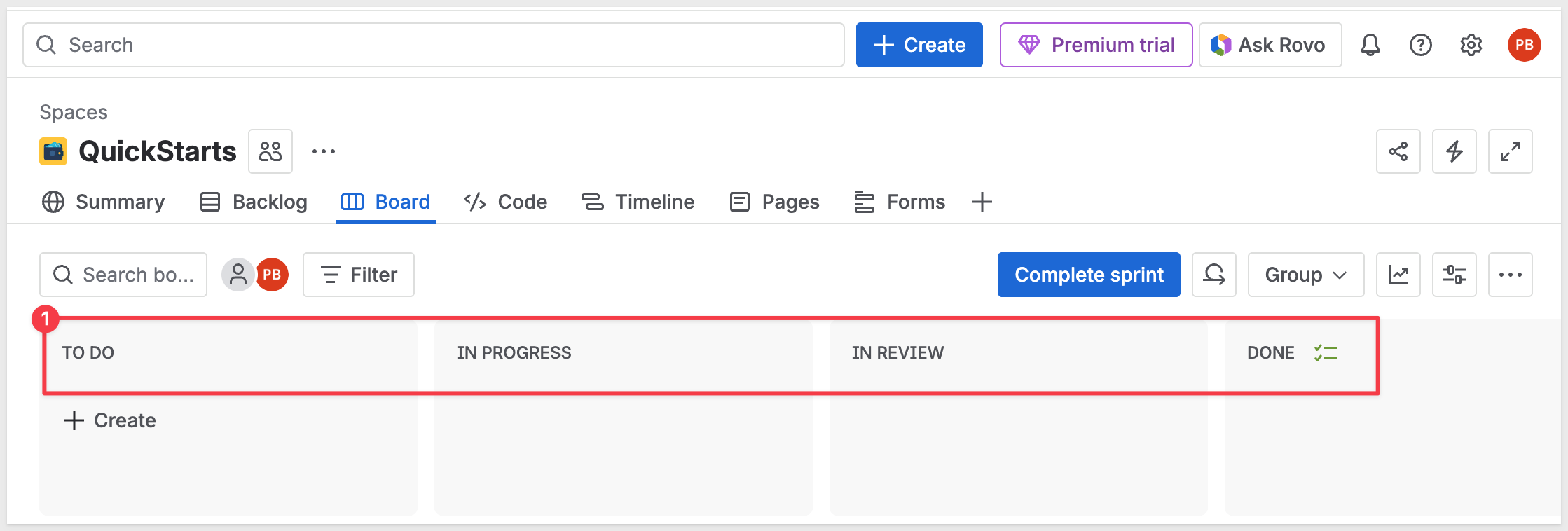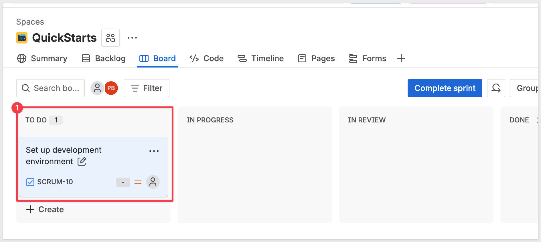 https://YOUR-DOMAIN.atlassian.net/jira/software/projects/SCRUM/boards/1To Do, In Progress, In Review, Done.JIRA may have created a couple of default tasks (Task 1, Task 2) to get you started. You can keep these or delete them to make the UI cleaner.