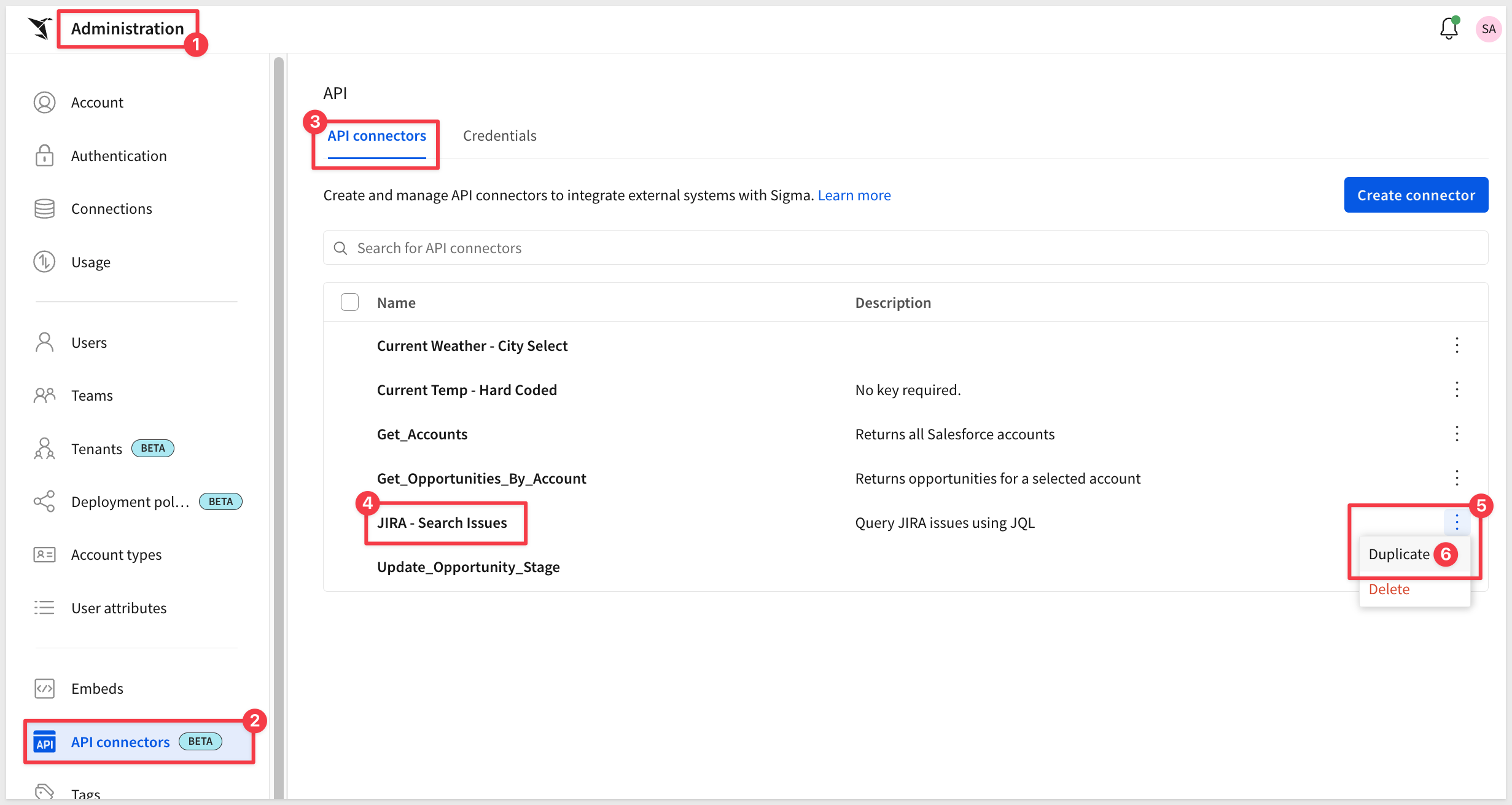 Administration > API ConnectorsJIRA - Search Issues connector and click the three-dot menuDuplicate: