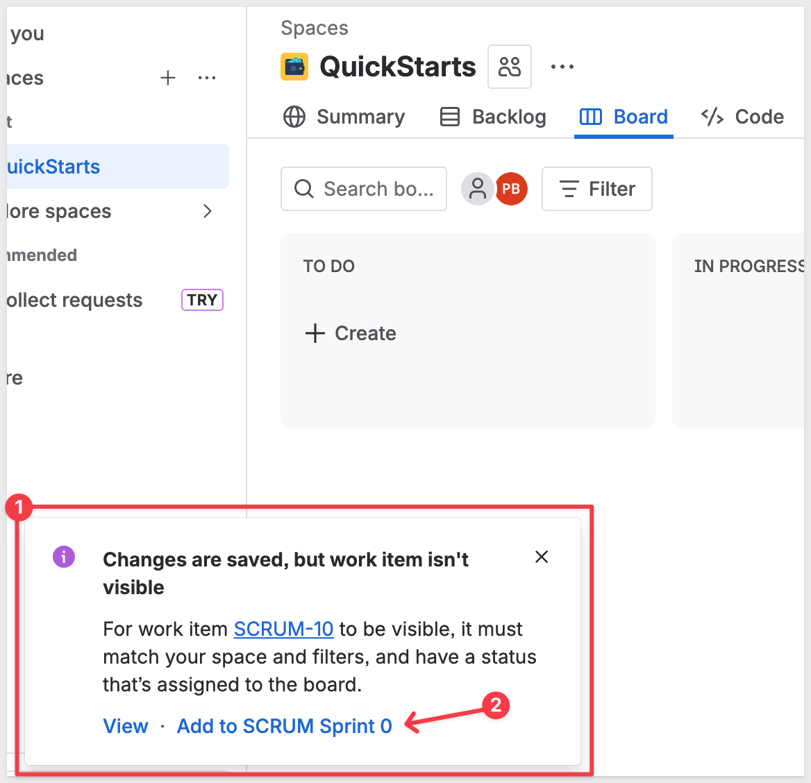 Task for Work type.Summary field, use Set up development environmentCreate.A popup will appear that allows us to assign the new task to our default scrum and sprint. Click the Add to SCRUM Sprint 0 link: