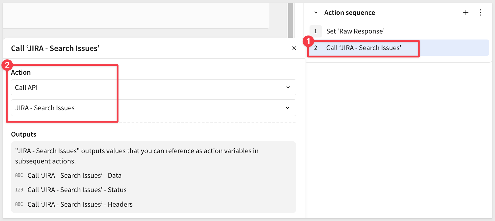 Call APIJIRA - Search IssuesSearch with JQLThe Outputs section shows the action variables: