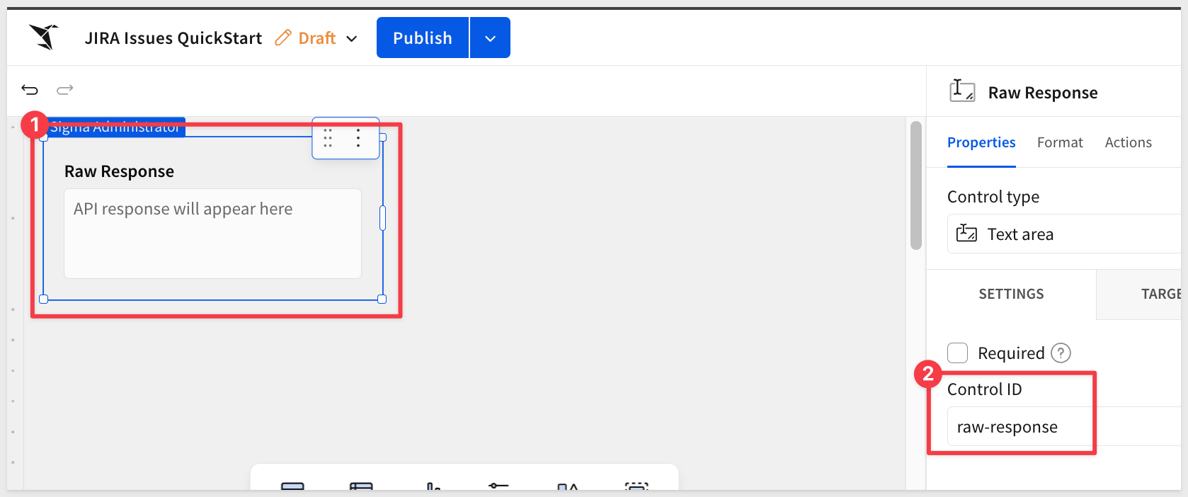 Create New > WorkbookSave as and name the workbook JIRA Issues QuickStart in your preferred locationPage 1 to IssuesElement bar, add a Text area control from the Controls groupraw-responseFormat > ELEMENT STYLE tab): API response will appear hereThis control will display the raw JSON response for debugging purposes.