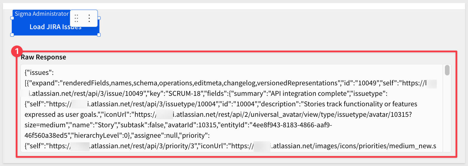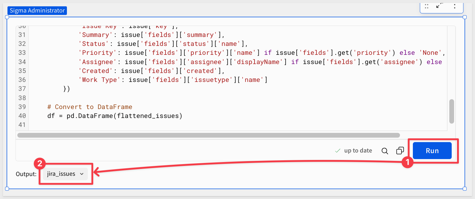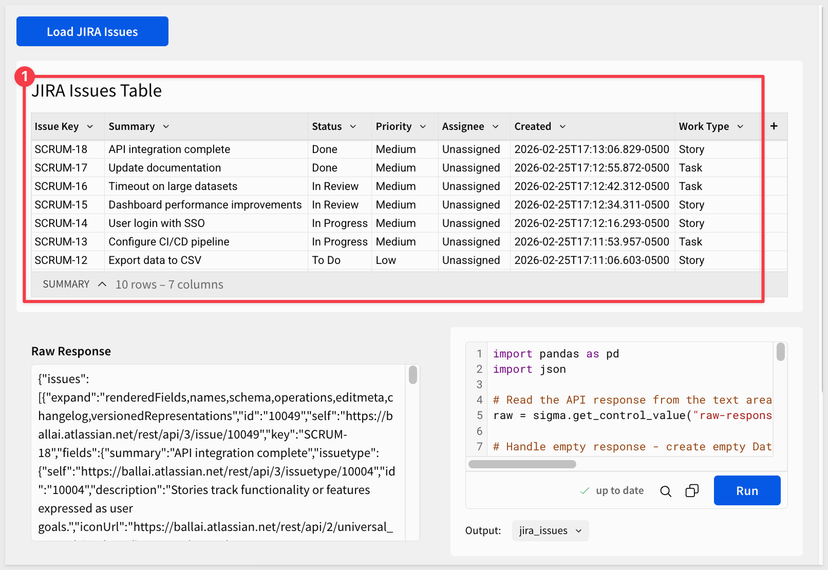 JIRA's API returns nested JSON with arrays of issues, each containing multiple fields. Python elements (which run on Snowflake) let us transform this JSON into tabular data that Sigma can display and analyze.