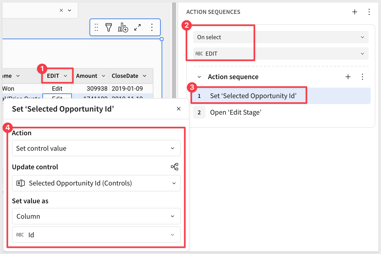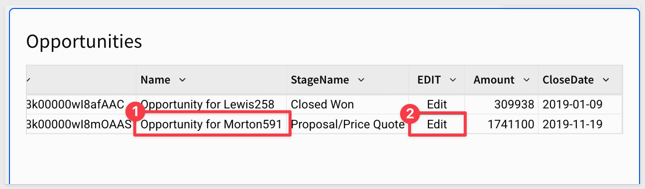 We need a way to set a new value for the stage of a selected opportunity. There are many ways to design a UI to support this, but we will use a simple one: adding an "Edit" column to the Opportunities table and setting an action against it.