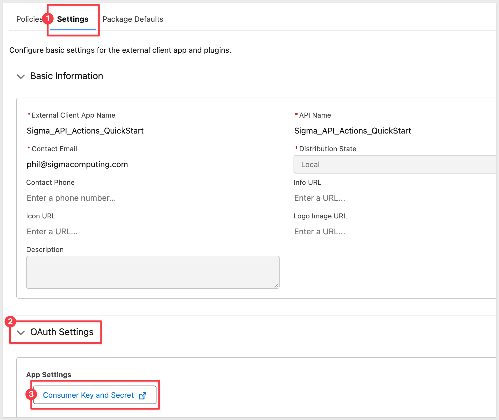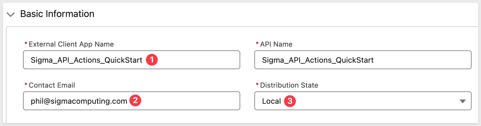 Provide a name such as Sigma_API_Actions_QuickStart, Contact Email and Distribution State as Local.