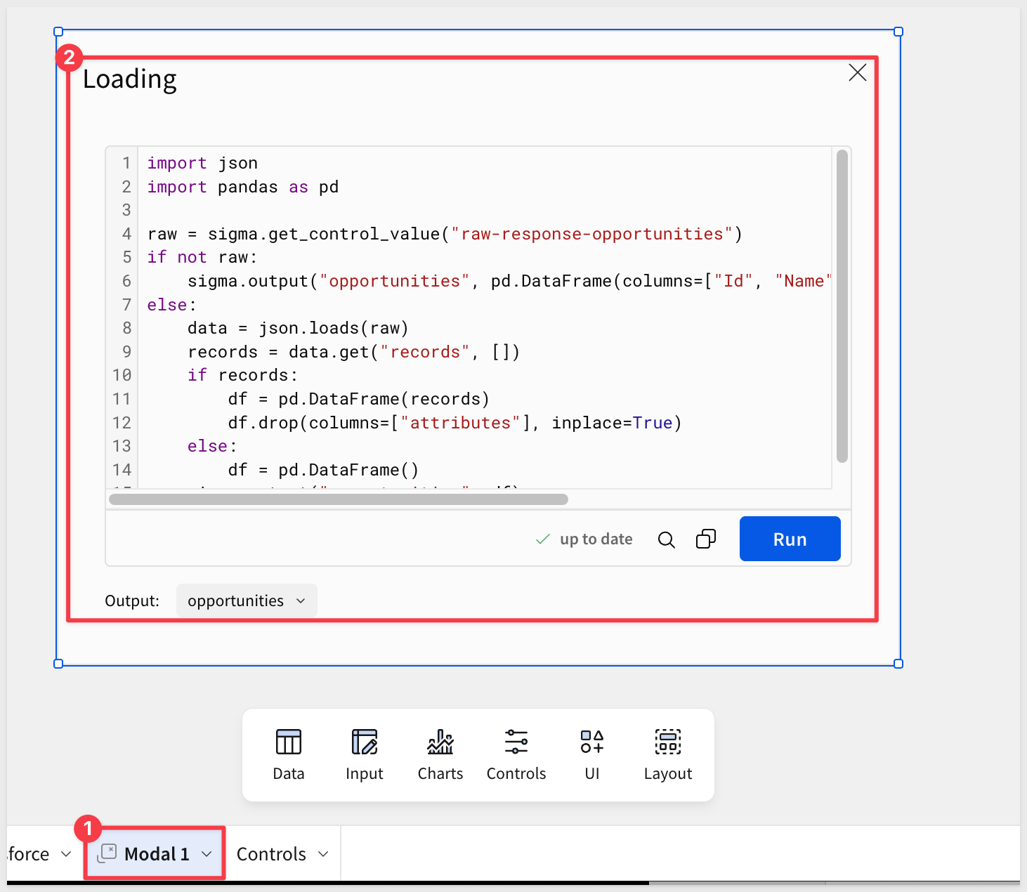 Click Run. Once execution completes, Output: opportunities appears at the bottom of the element.