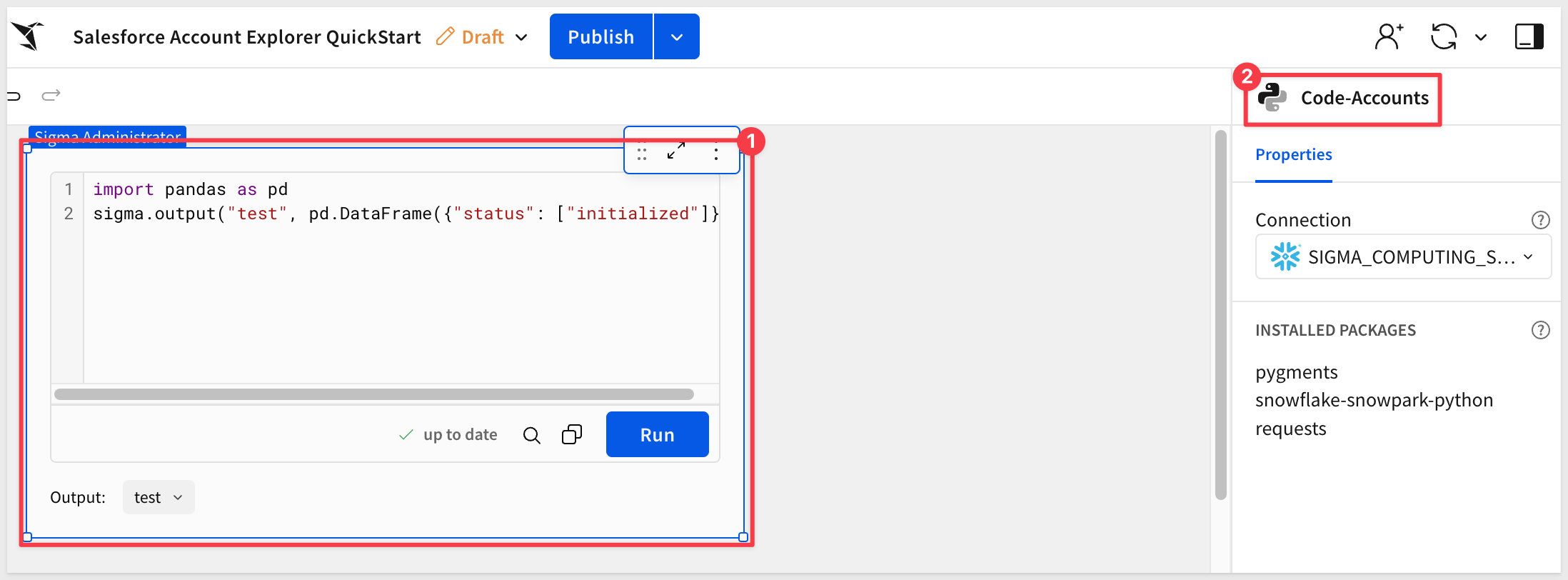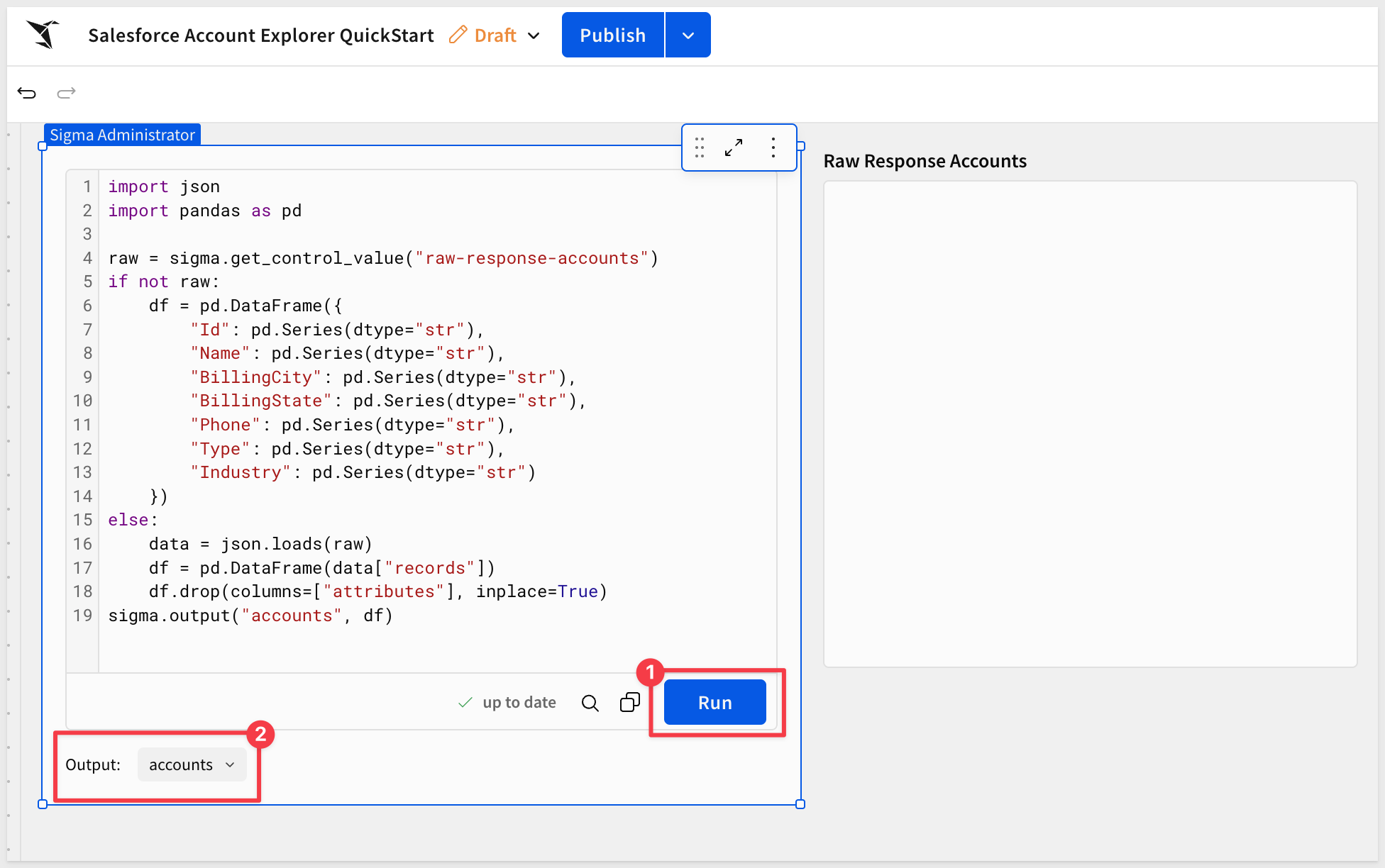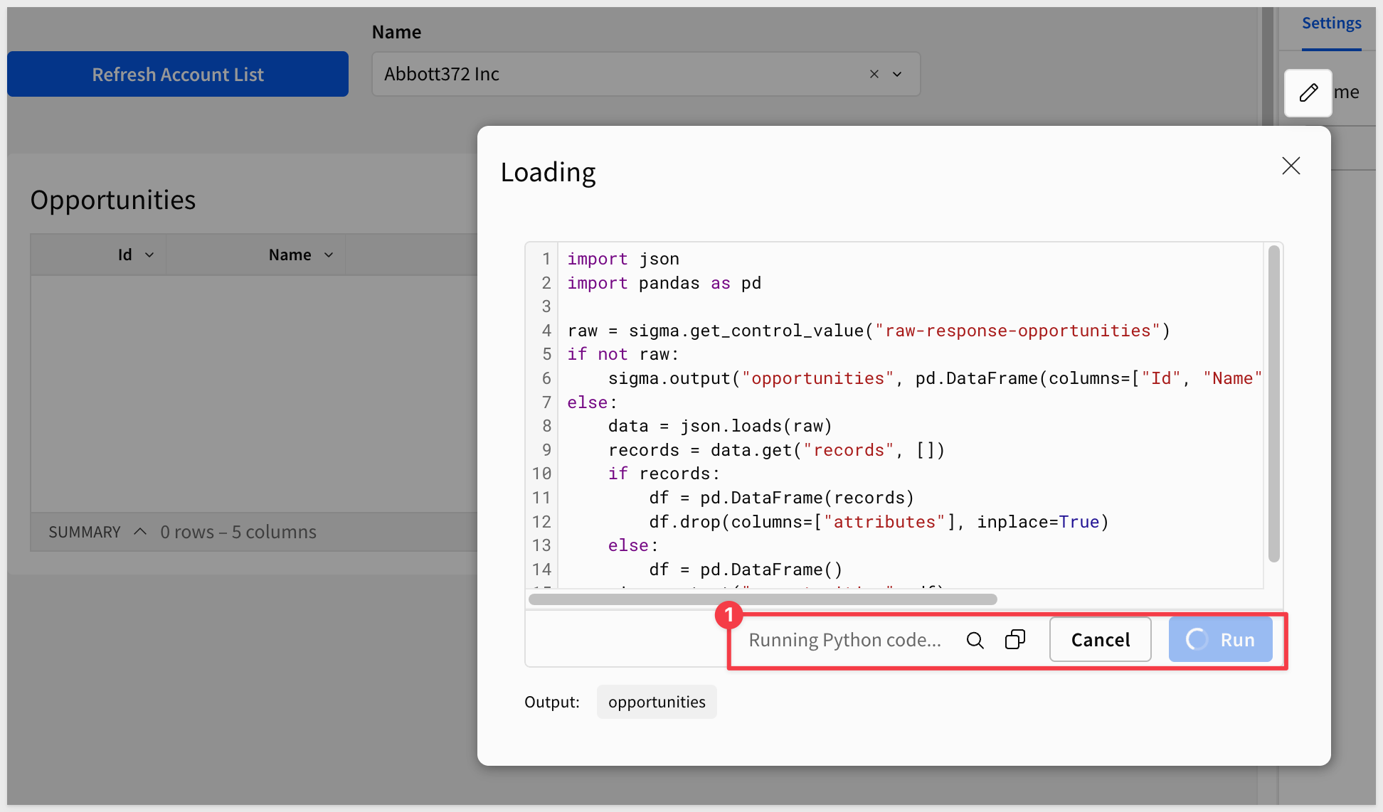 Sigma's API Actions return raw JSON responses. To parse a bulk response (like a list of Salesforce accounts) into an interactive table, we use a Sigma Python element. Python elements in Sigma run on Snowflake compute and require a dedicated warehouse.