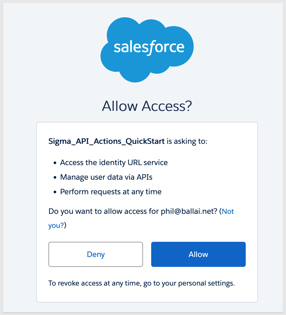 Before calling Salesforce APIs from Sigma, you must configure a secure OAuth 2.0 connection. Salesforce requires an access token for every request, and these tokens expire on a schedule determined by your Salesforce org. API Actions can store and refresh tokens automatically, but the initial setup requires a one-time authorization.