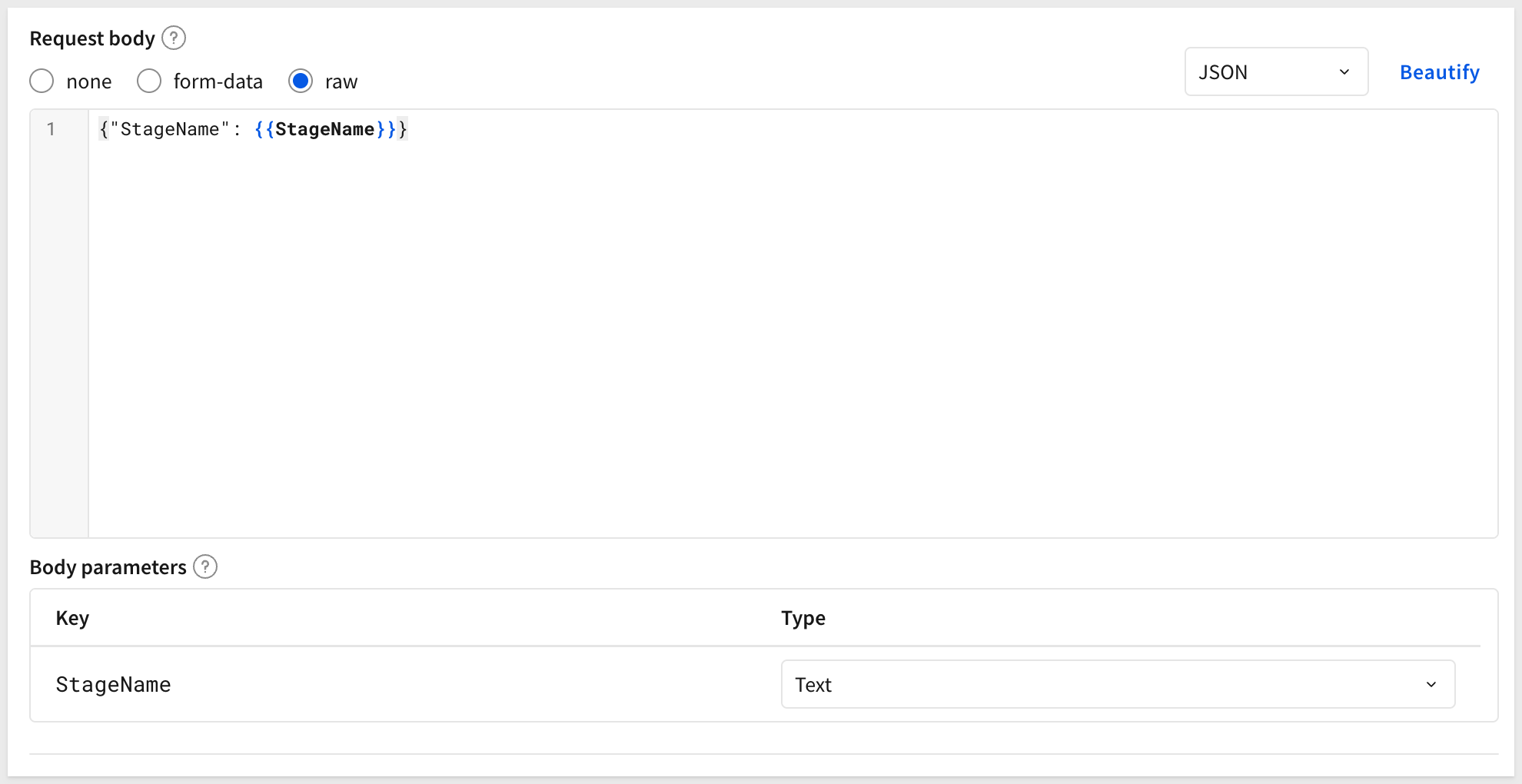 Under Body parameters, configure StageName as: