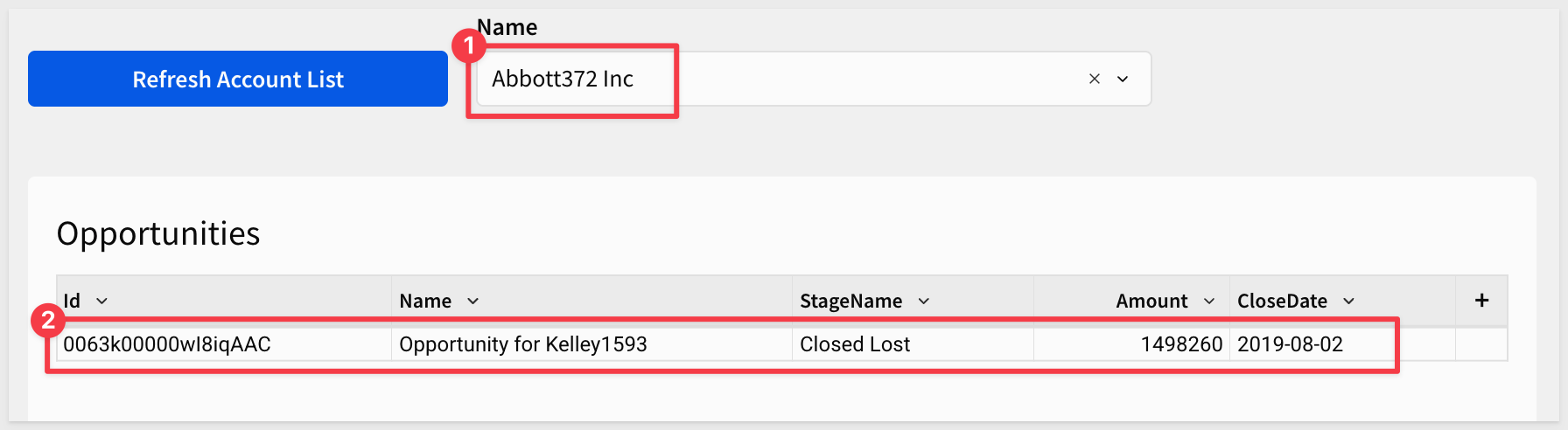 Of course you need to select an account that has an opportunity. Developers accounts use standard data so we used Abbot372 Inc: