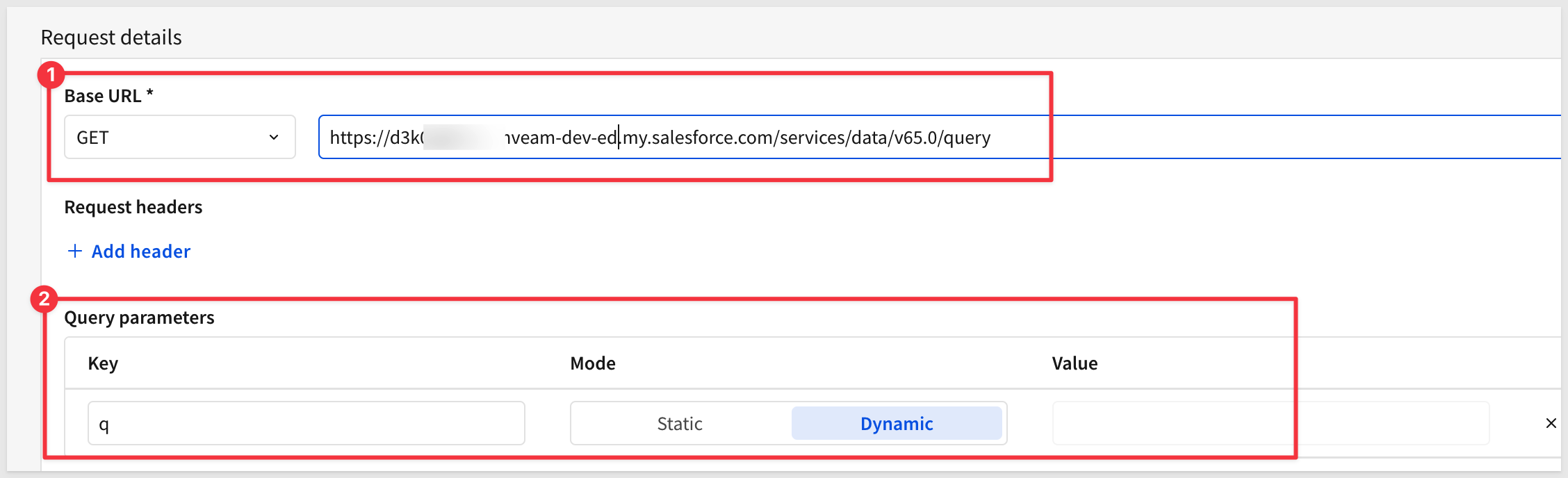 Under Query parameters, click Add parameter and set the following: