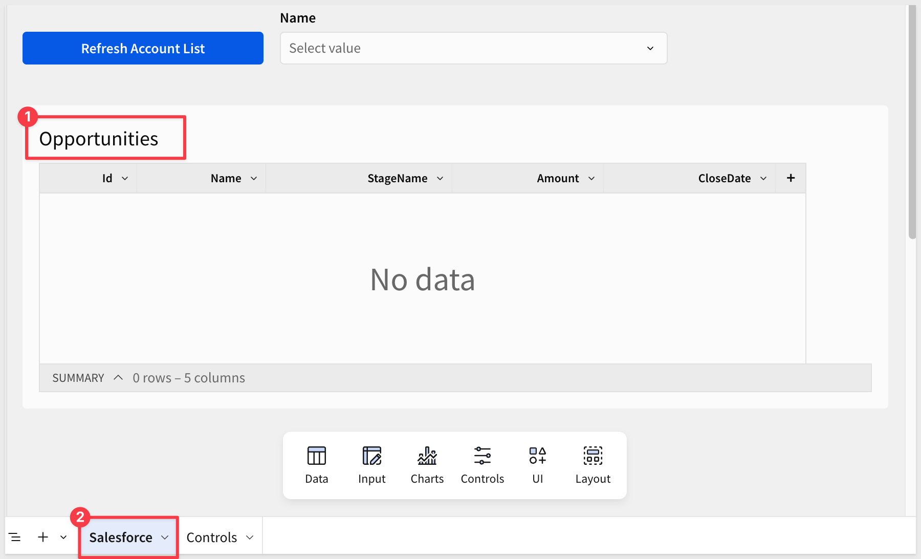 The Salesforce page now has the Refresh Account List button and account name selector. The Controls page holds all the plumbing — text area, Python element, and accounts table.
