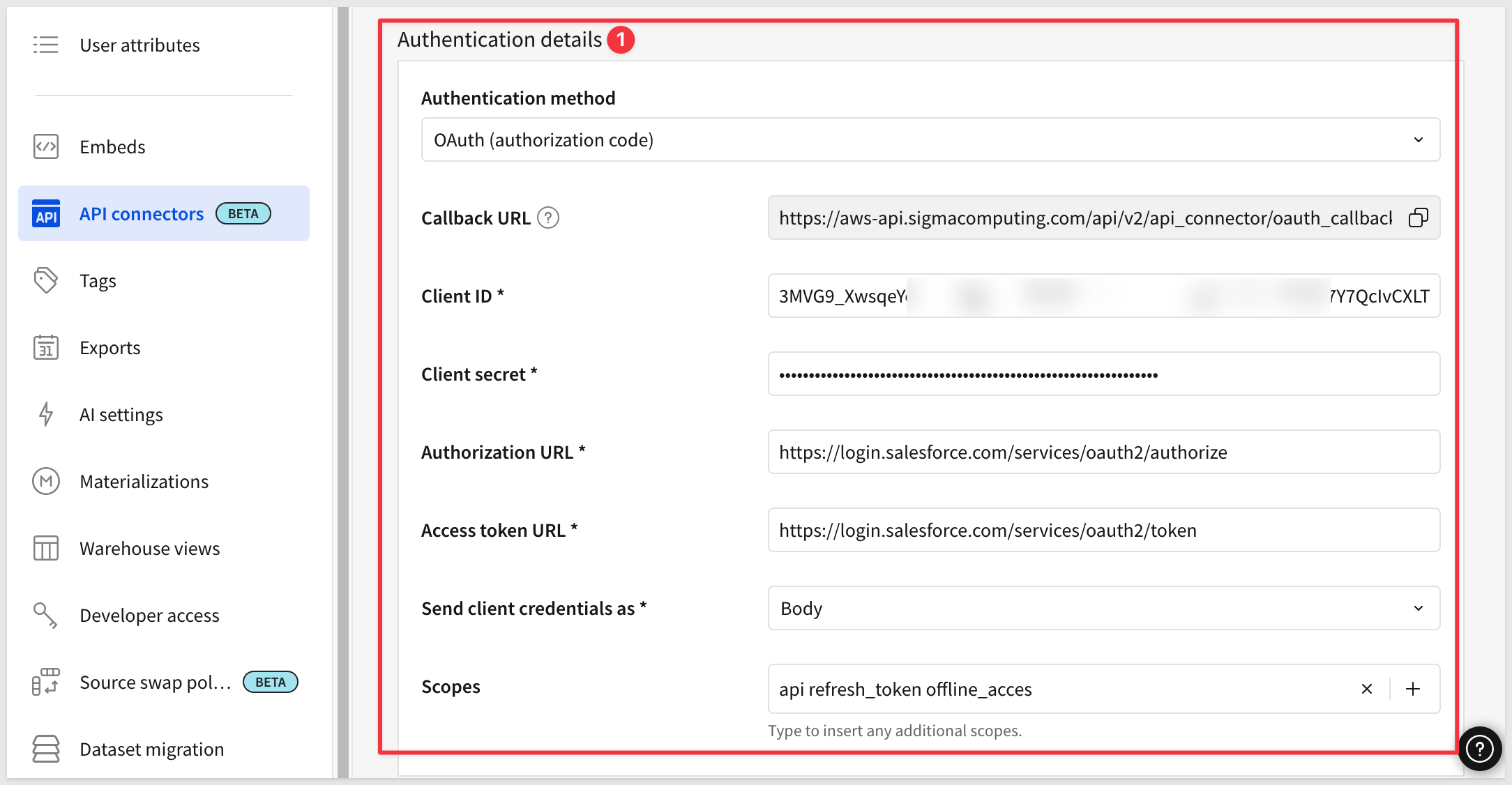 With the Salesforce Connected App in place, we can now configure the matching credential in Sigma.