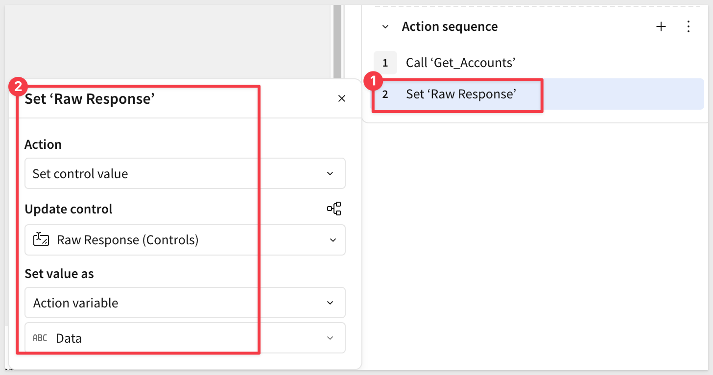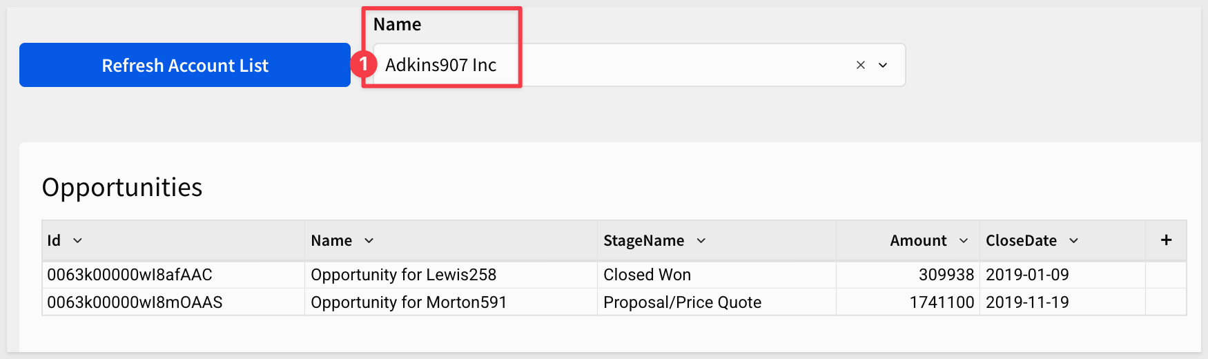 With the accounts list in place, we can now wire up the account-id selector to call the Salesforce opportunities endpoint and display results for the selected account. The pattern mirrors the accounts flow: an action writes the raw API response to a text area control, and a Python element parses it into a table.
