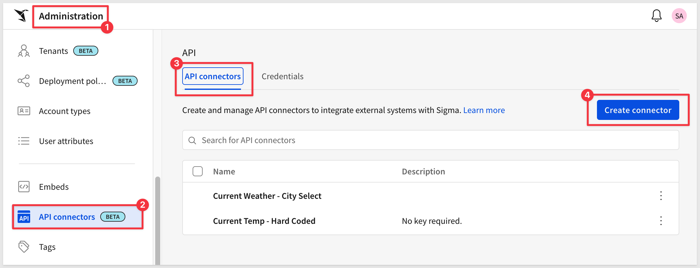In Sigma, navigate to Administration > API connectors and select the Credentials tab.