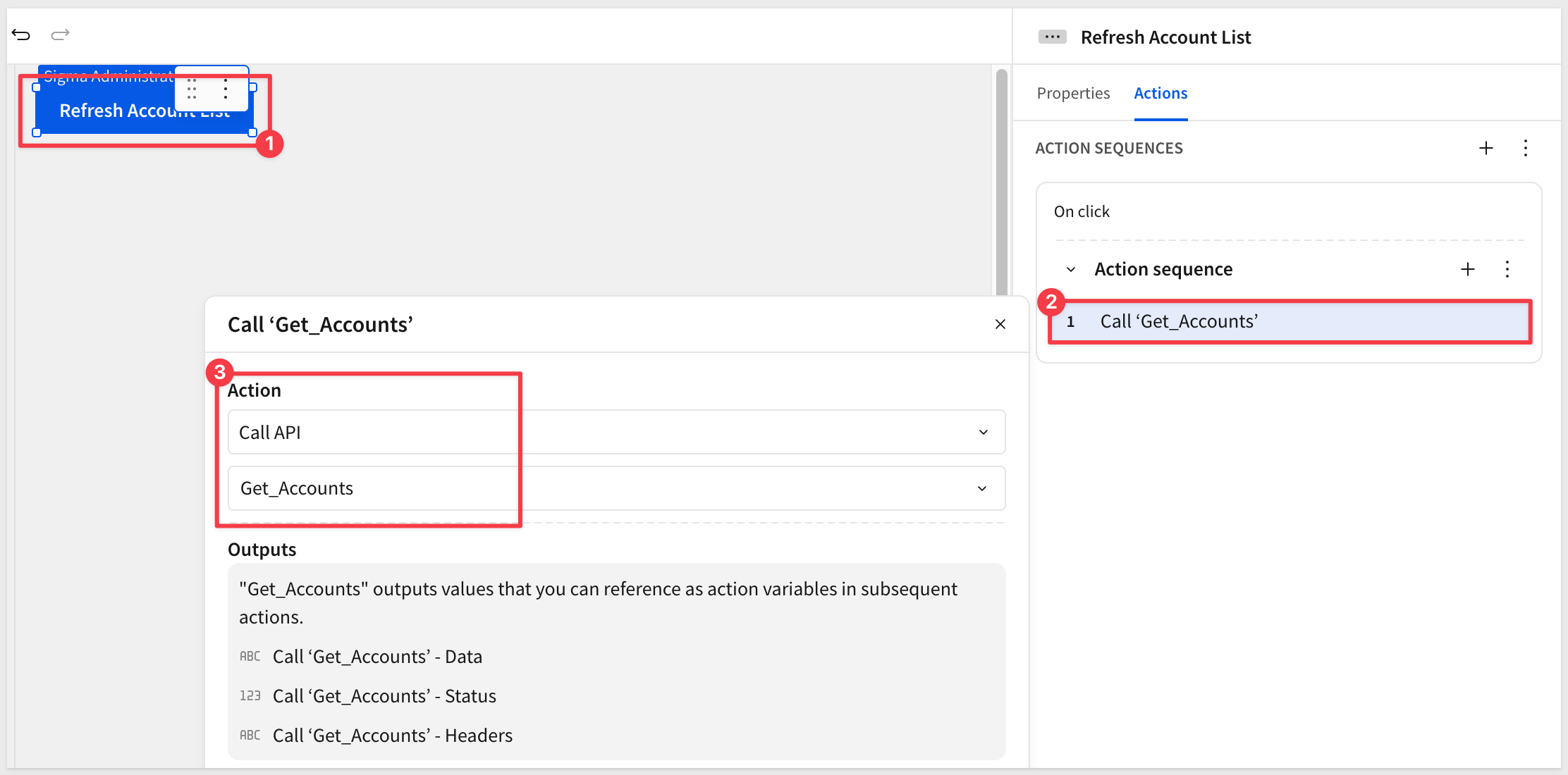 Click the account list control to select it. Open the Actions panel and click + to add an action sequence.