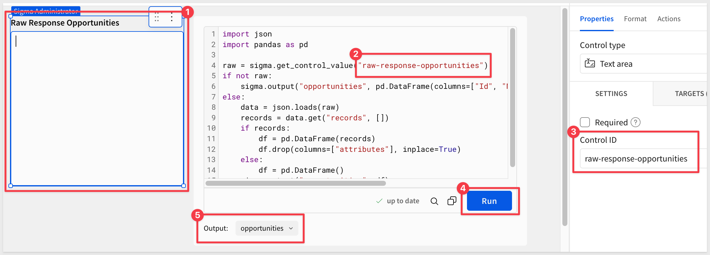 The Salesforce API returns a raw JSON payload. We store it in a text area control so a Python element can read and parse it.