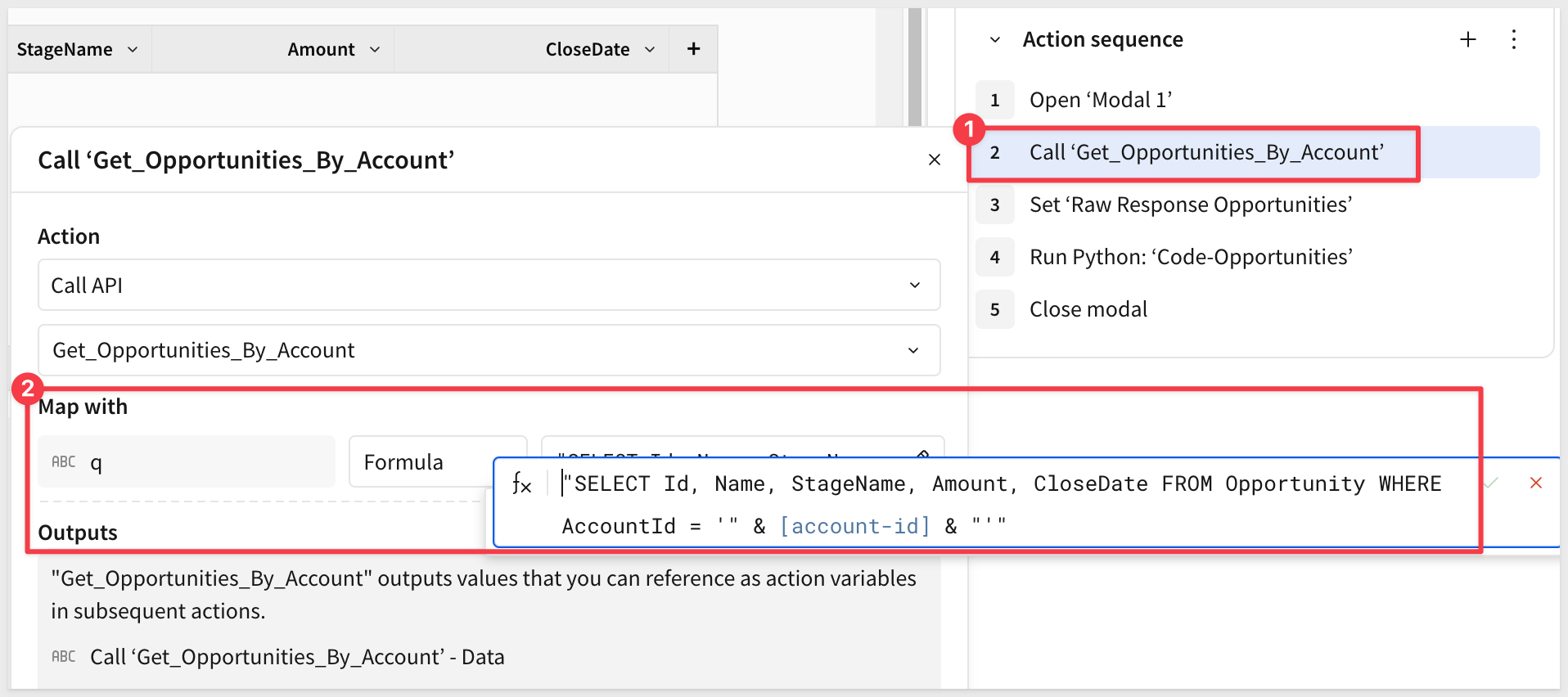 Id parameter: Map to the selected-opportunity-id control (on the Controls page)StageName parameter: Map to the new-stage control (in the modal)For step 2, configure the dynamic q parameter using a formula: