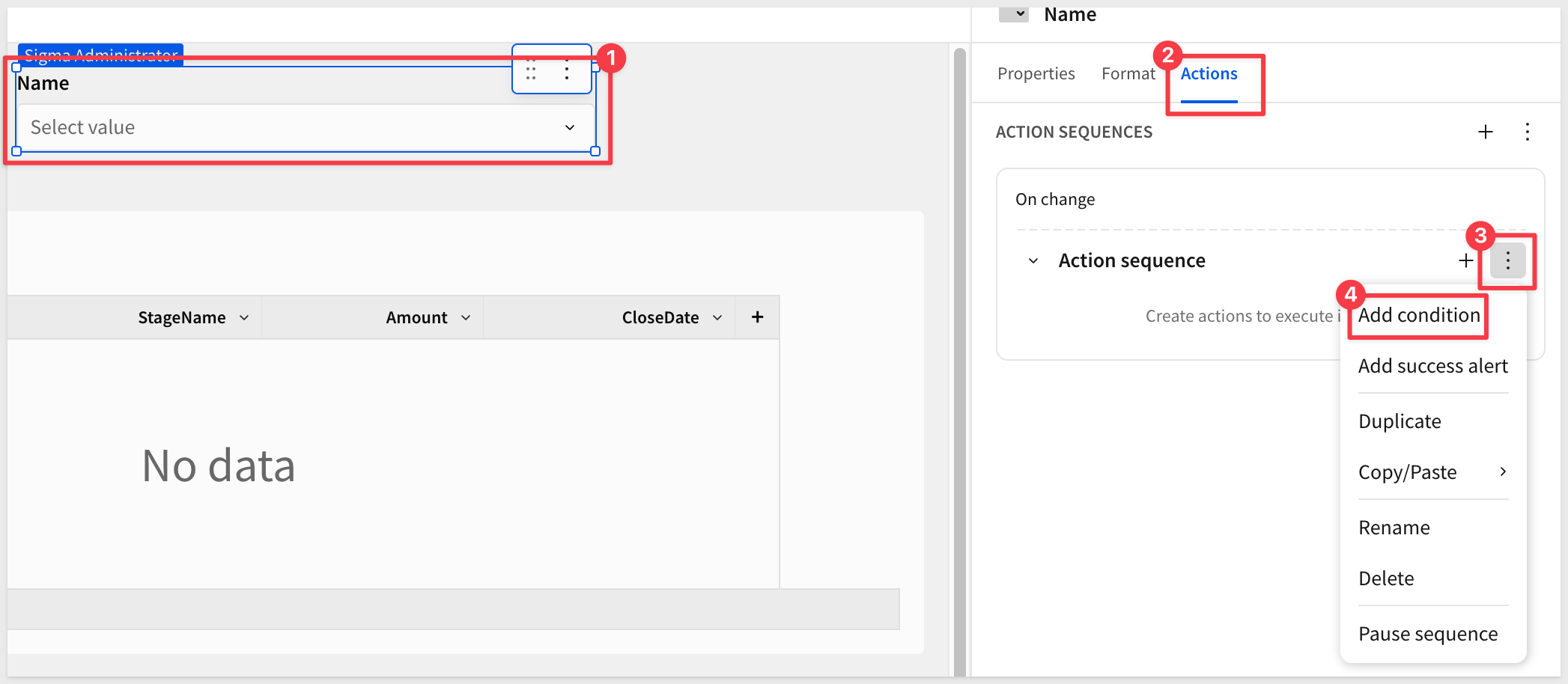 With the Edit column selected, open the Actions panel and click + to add a row-level action sequence.