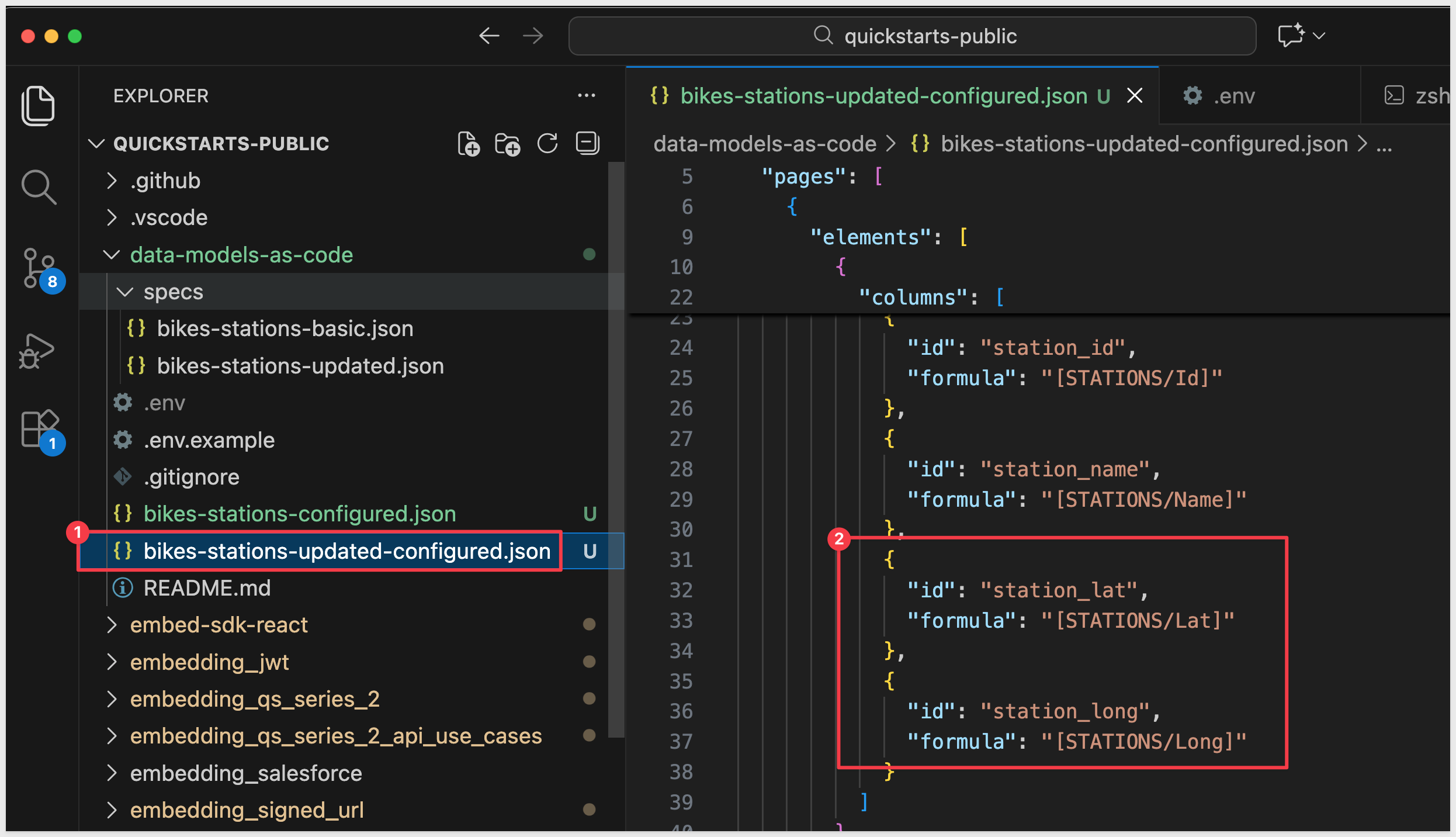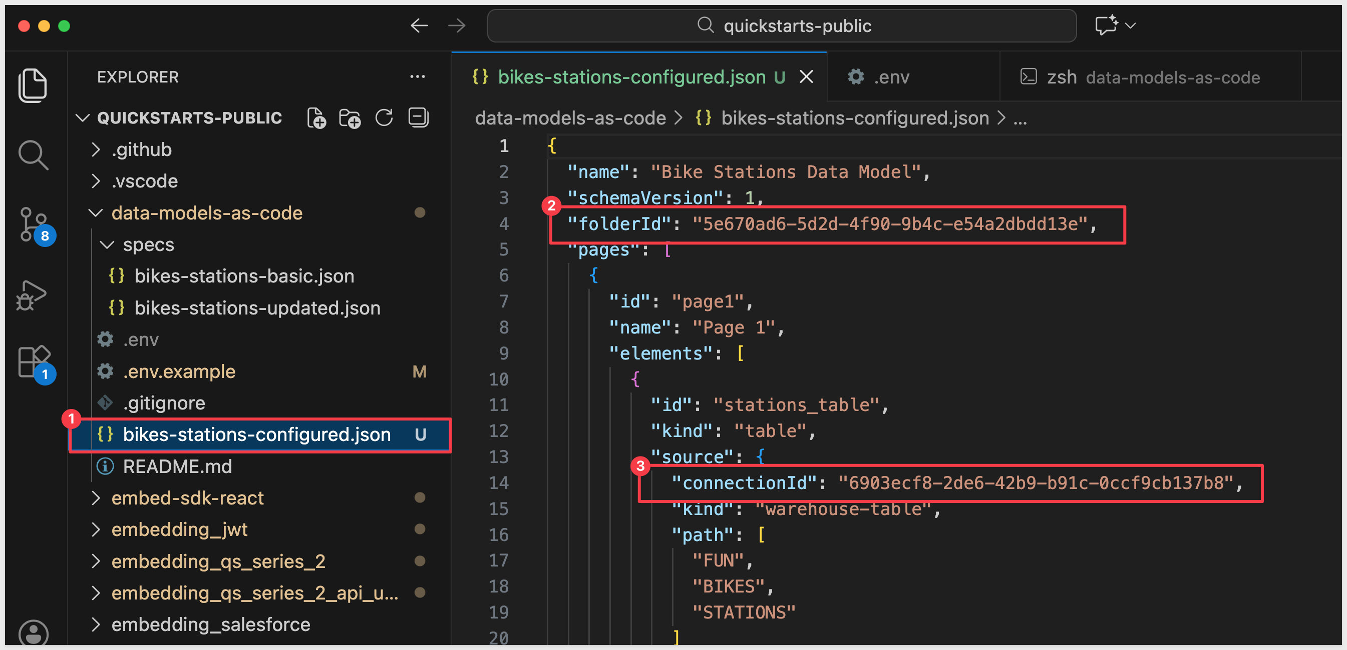 The specs/bikes-stations-basic.json file from your cloned repository contains placeholder values. Replace them with your actual IDs using environment variables: