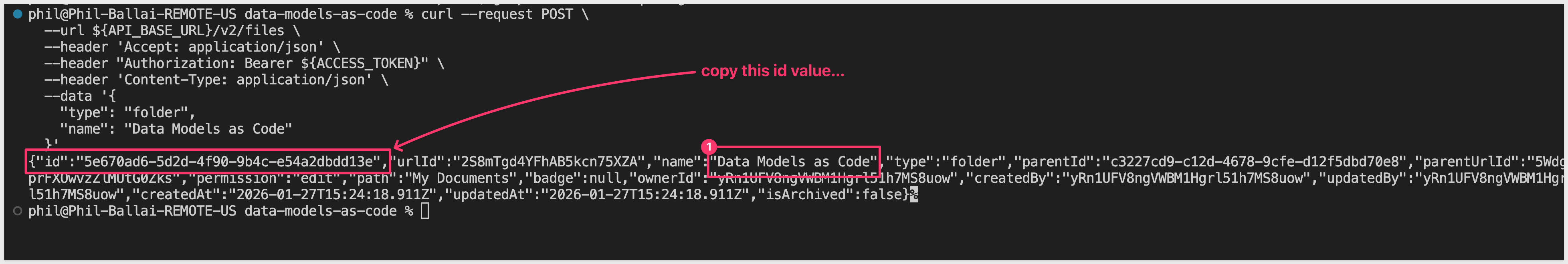 This loads your ACCESS_TOKEN, FOLDER_ID, and CONNECTION_ID for use in the following commands.