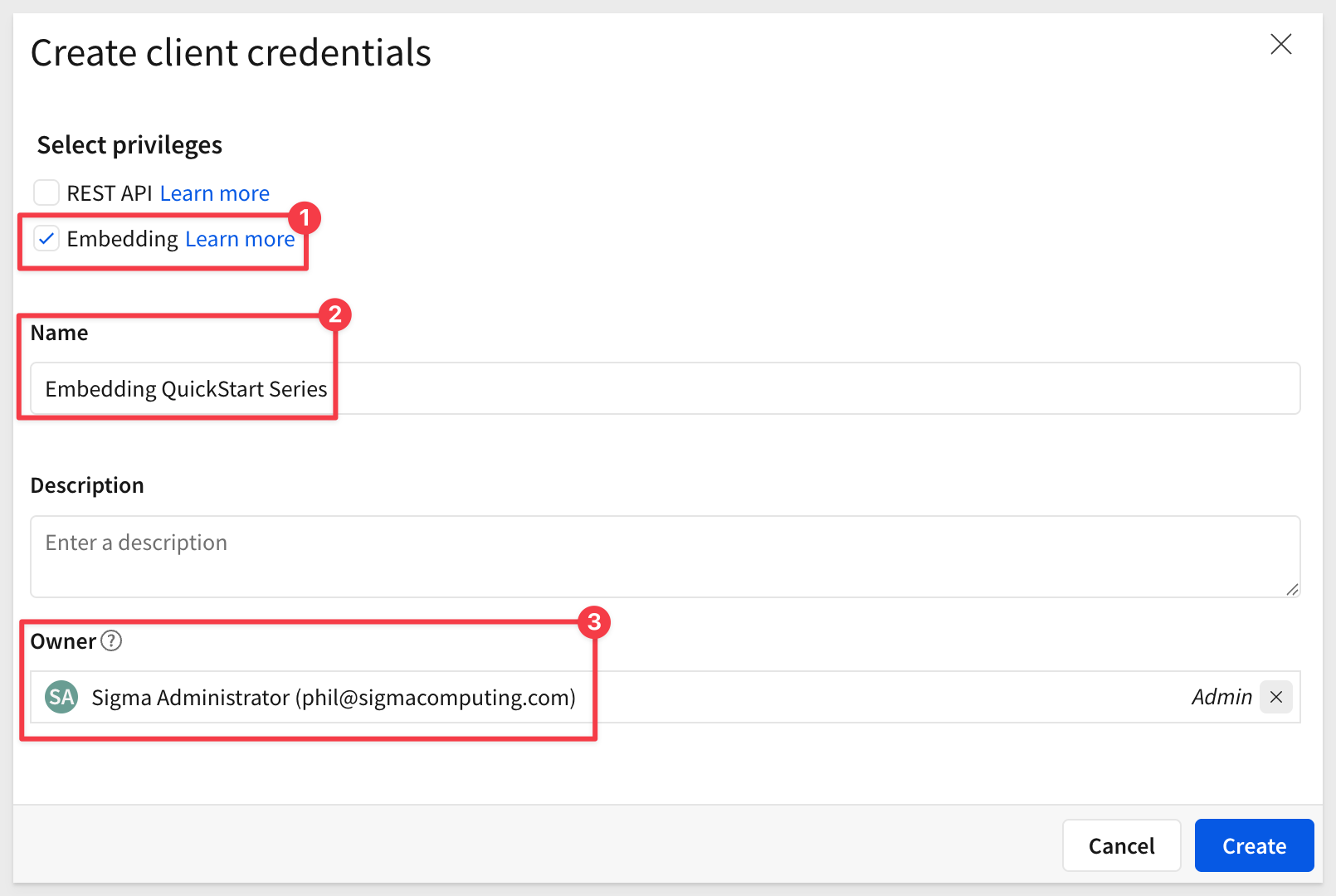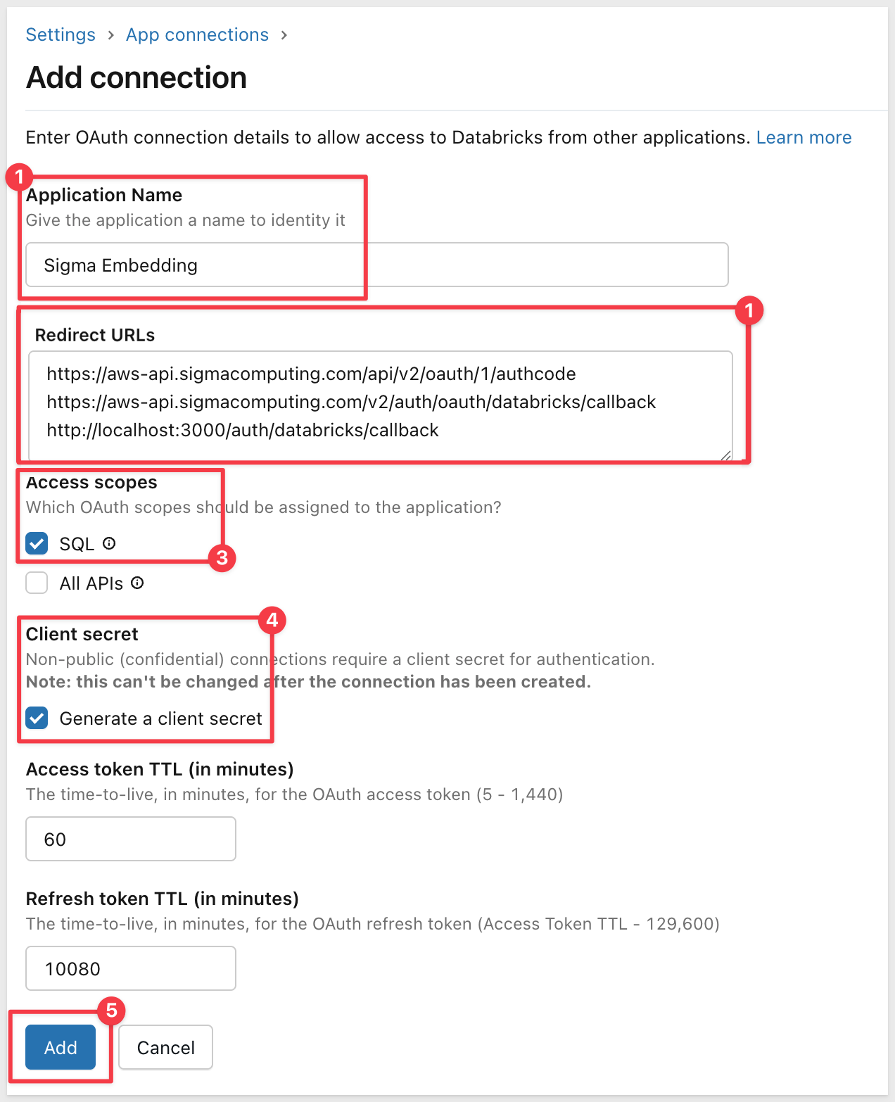 Redirect URLs: Sigma requires three redirect URLs for OAuth to work properly - one for connection authorization, one for embedded workbook access, and one for the locally hosted application we will provision later. Enter all three URLs based on your Sigma cloud instance (one per line).