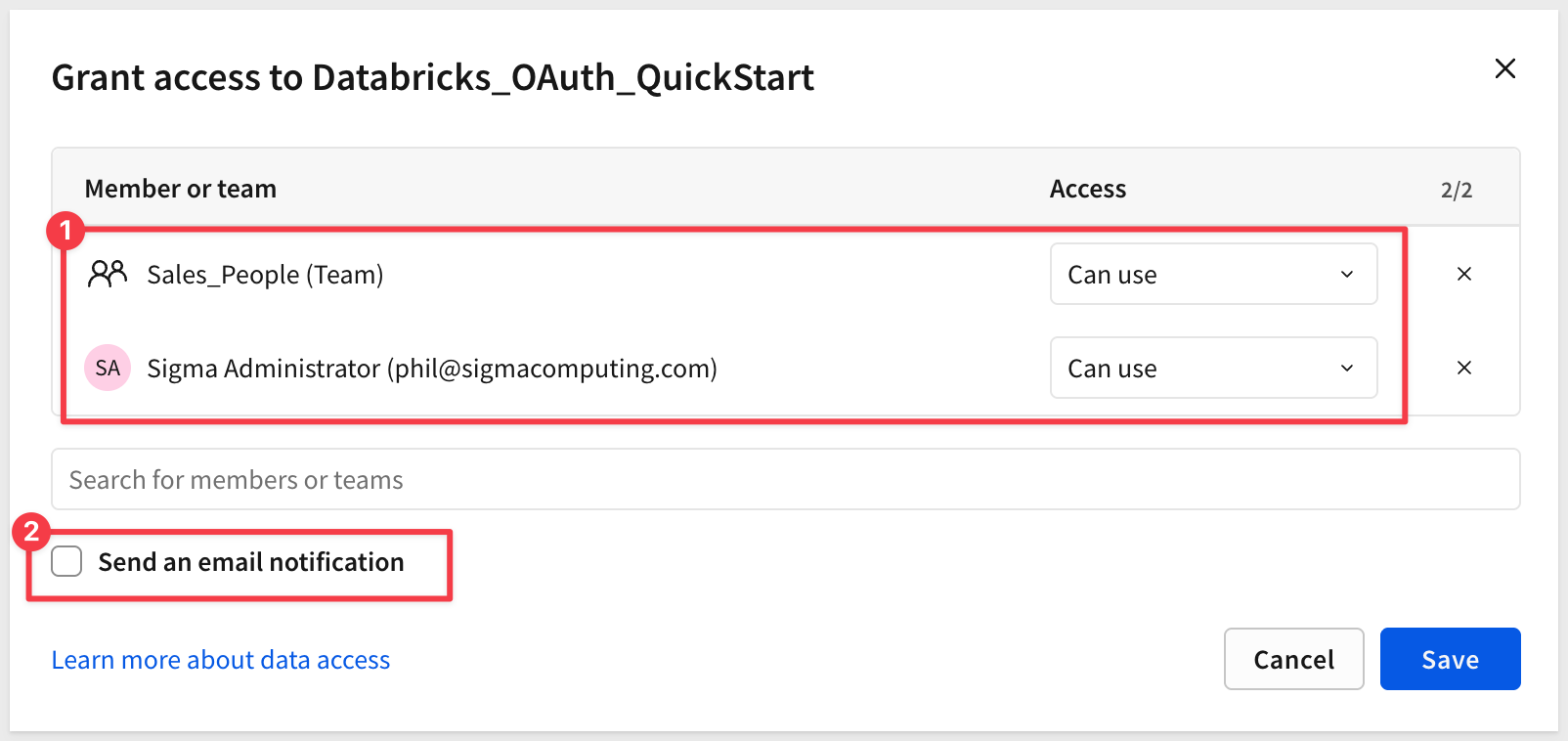 Allow or Authorize to grant Sigma accessAfter authorizing, you'll be redirected back to Sigma. You'll see the connection's Access tab showing No one has access to this connection.