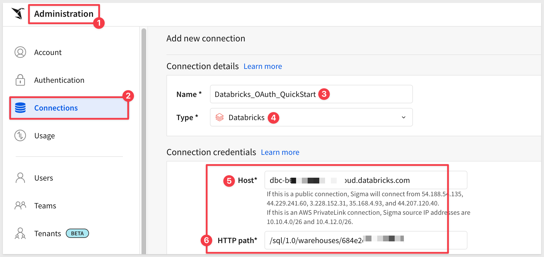 Return to Sigma and paste the Server hostname and HTTP path values into the connection form.