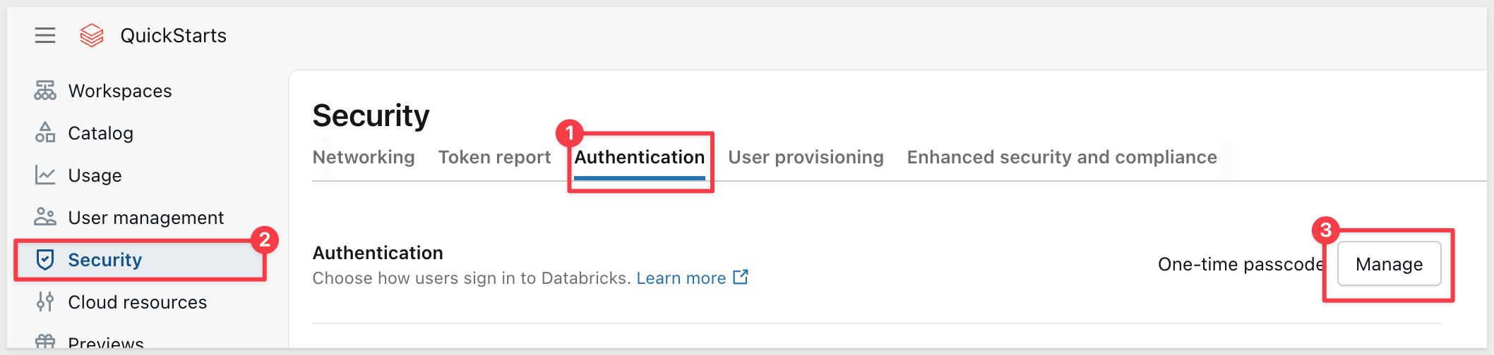If you're using a Databricks trial account for this QuickStart, you'll need to configure authentication to avoid using third-party authenticator apps like Google Authenticator. This step is specific to trial accounts without corporate SSO.
