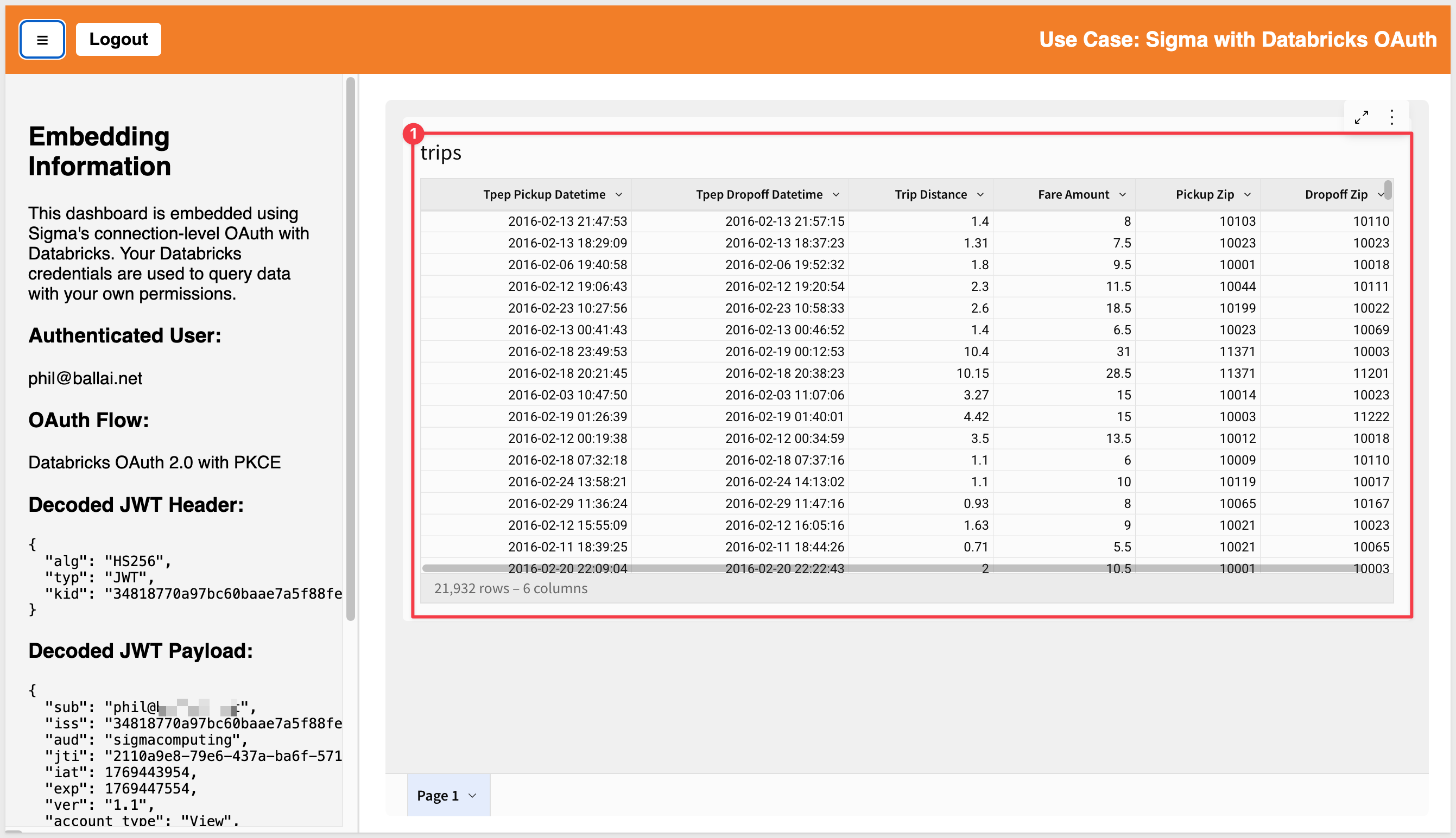 In this QuickStart, you implemented connection-level OAuth with PKCE for Sigma embedding with Databricks, creating a Node.js application that authenticates each user individually and passes their encrypted credentials to Sigma. This ensures embedded users query Databricks with their own permissions, providing true user-level data governance and complete audit trails.