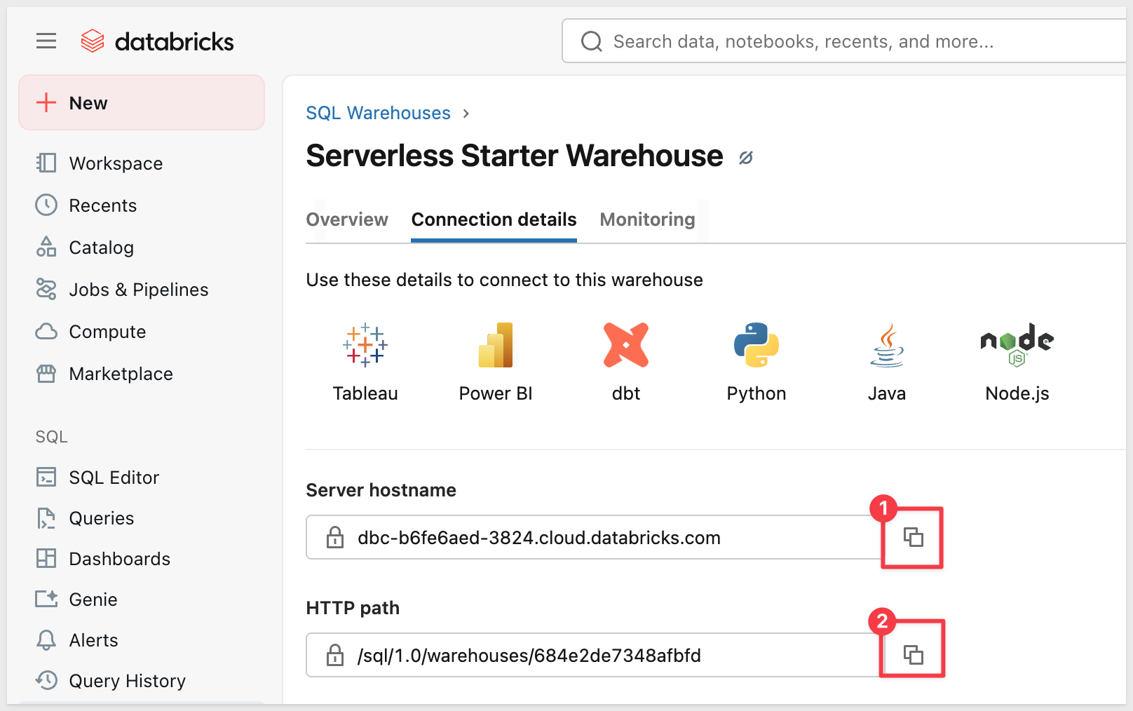 Click your SQL warehouse name, then click the Connection details tab.