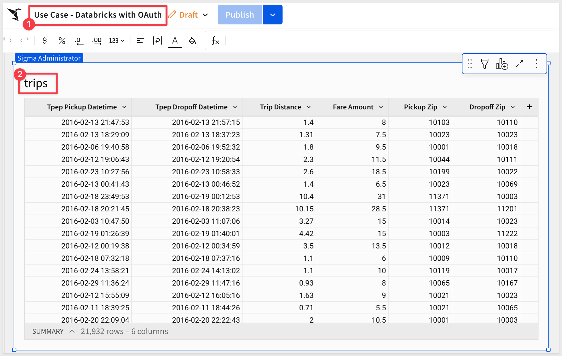 You can interact with the workbook just like any Sigma dashboard: filter data, drill down, and explore. All queries execute with your Databricks permissions: